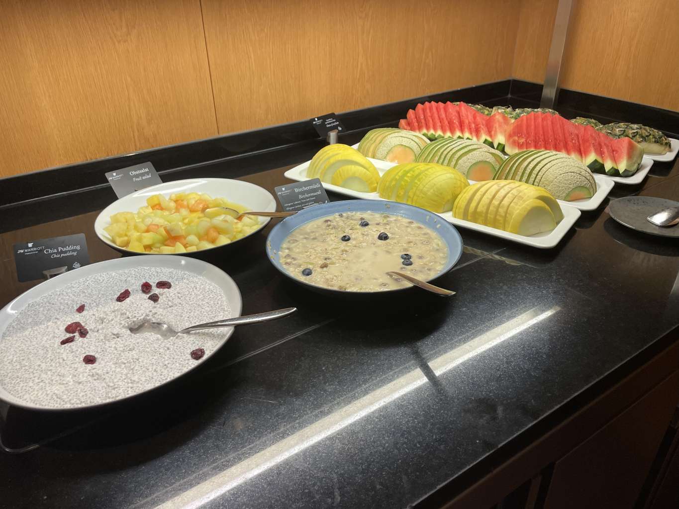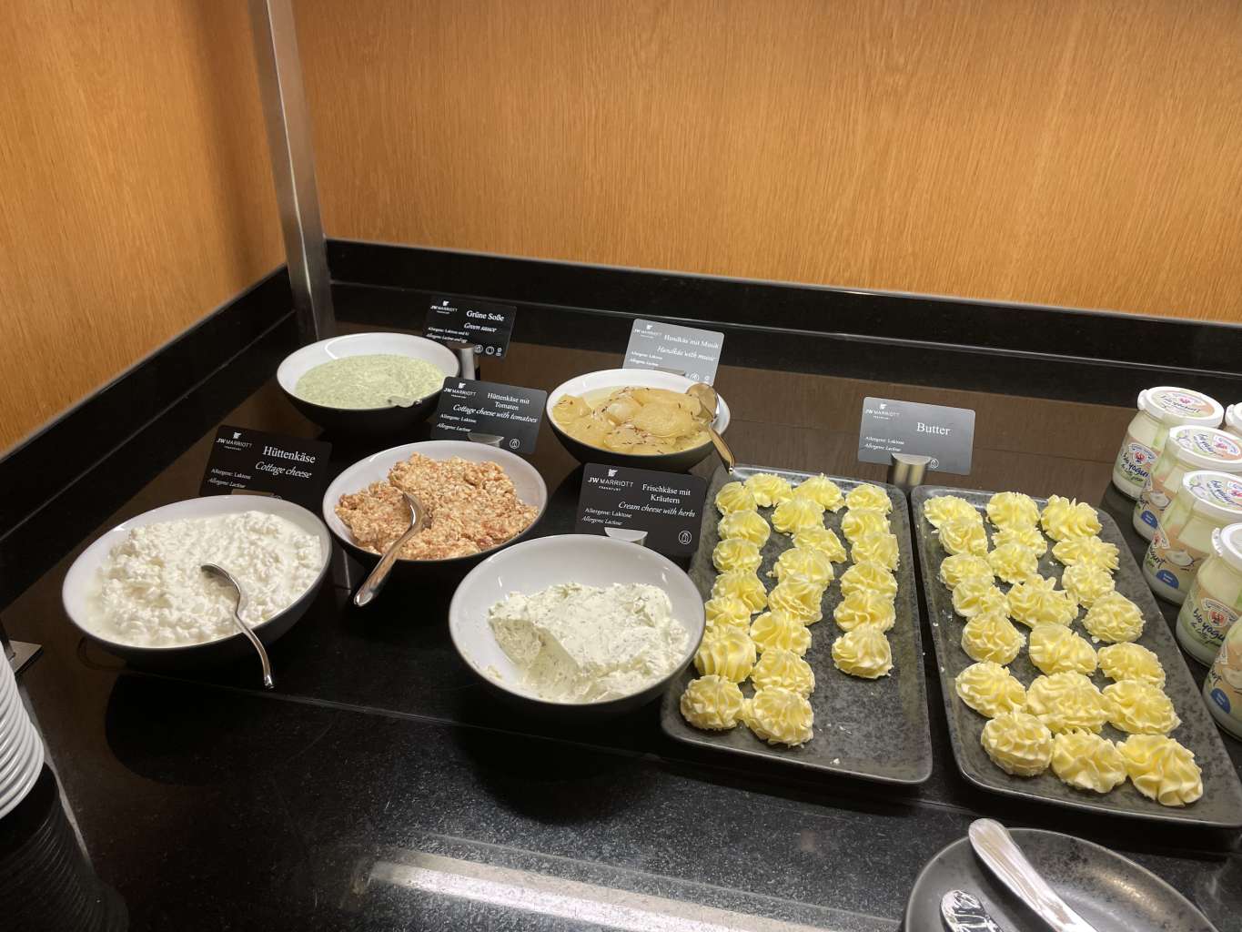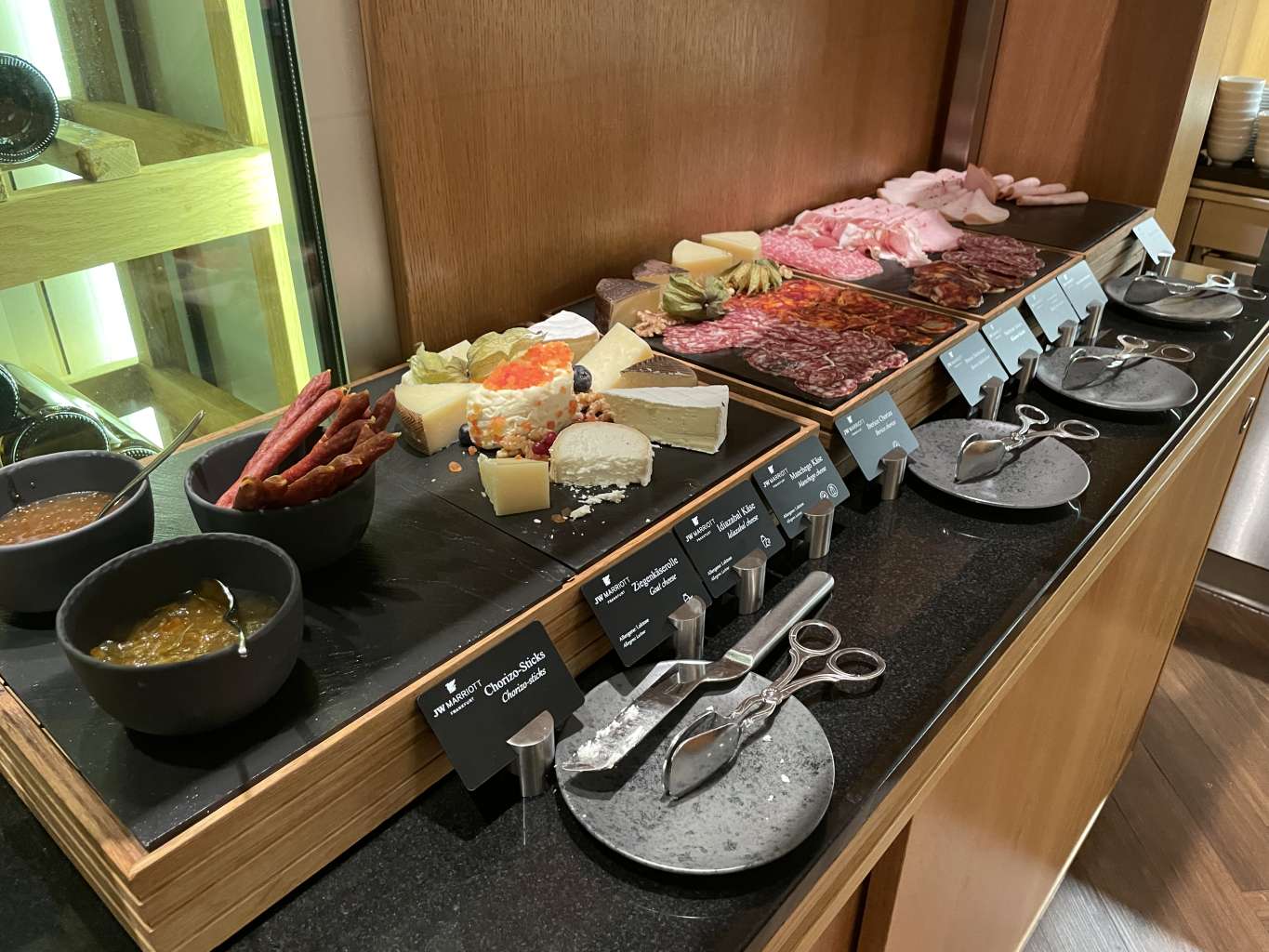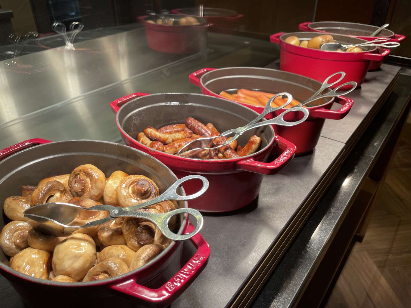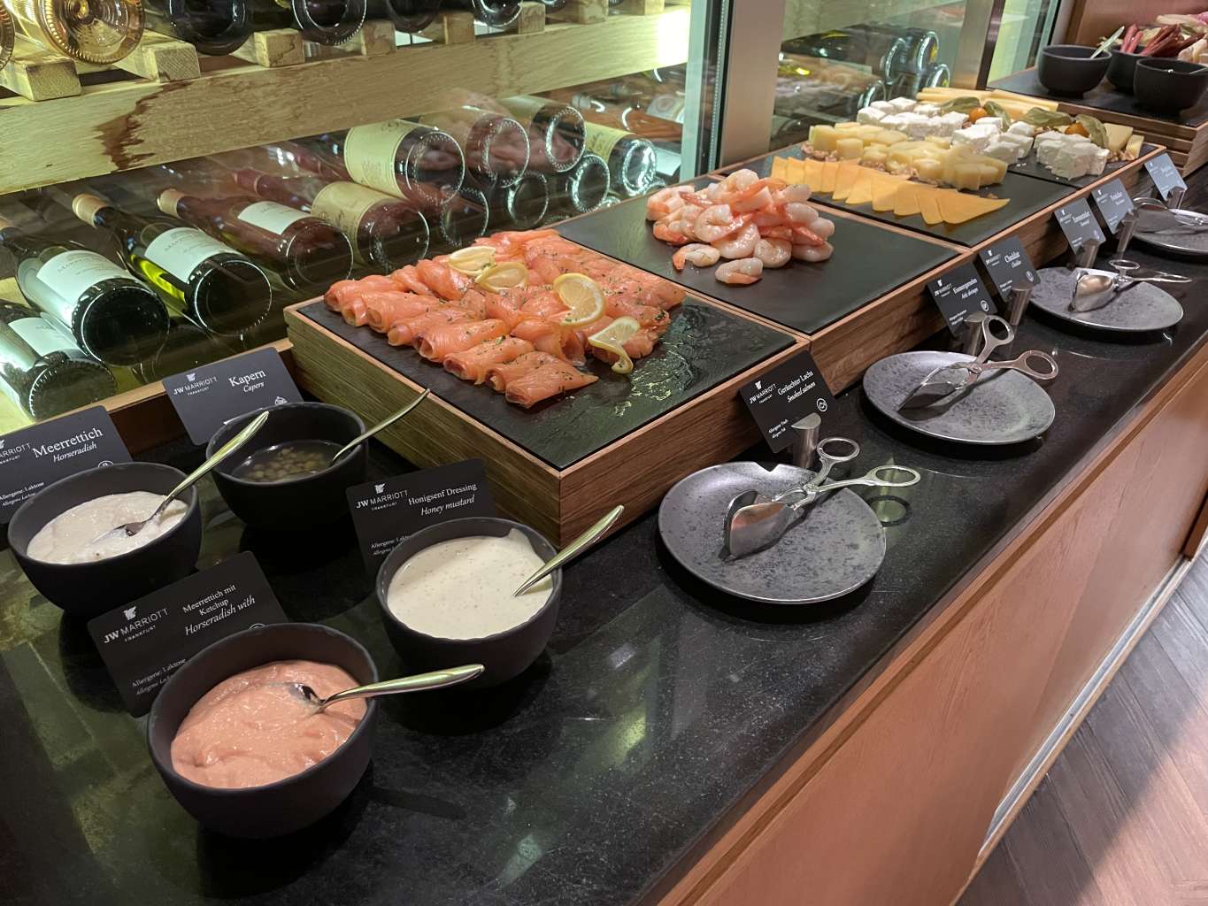 Das Frühstücks-Büffet im JW Marriott Frankfurt endet mit einer Bar bestehend aus Marmeladen, diversen Salaten, eingelegtem Gemüse und ein paar warmen Optionen, wie zum Beispiel Champignons und Würstchen.