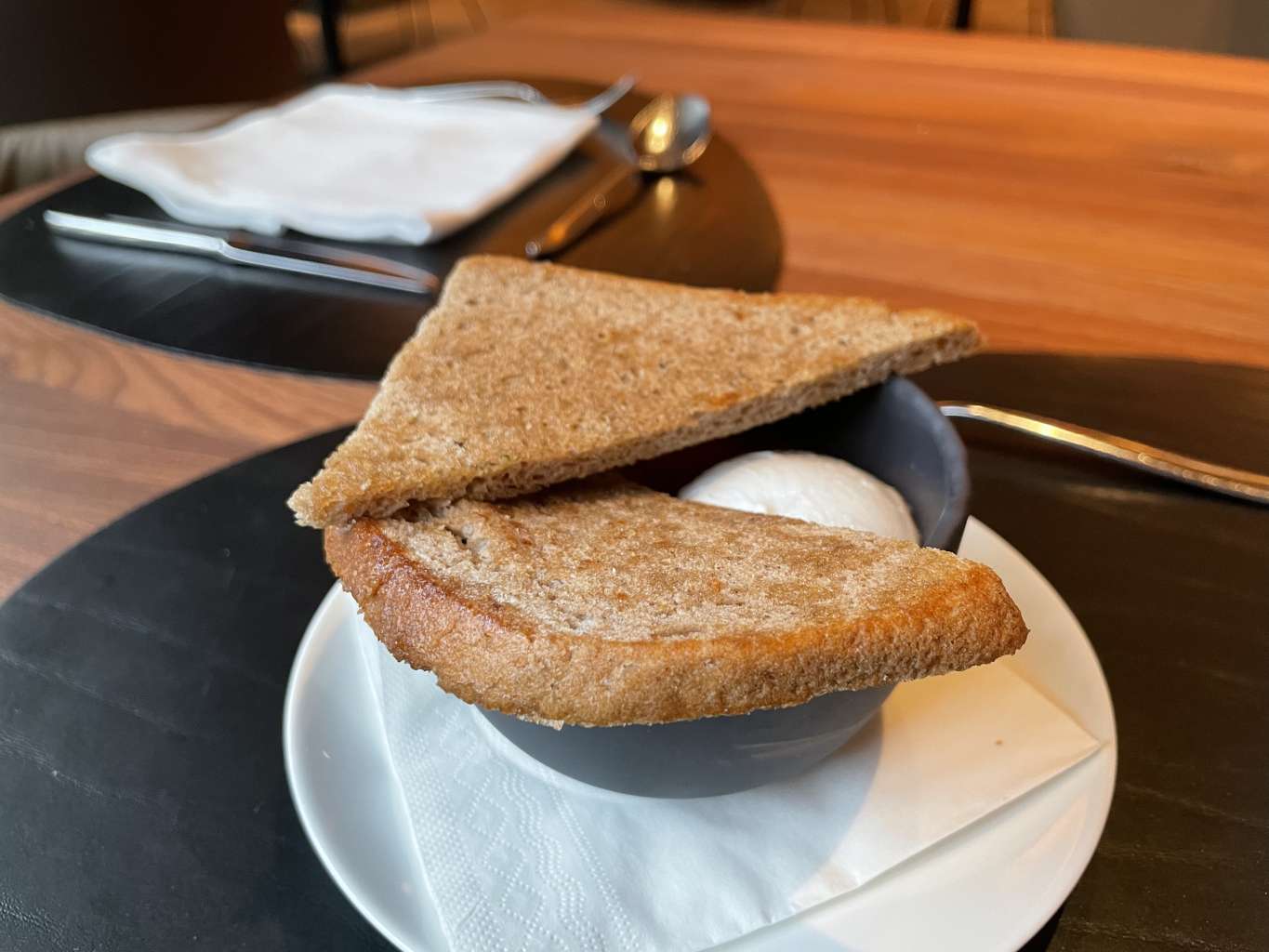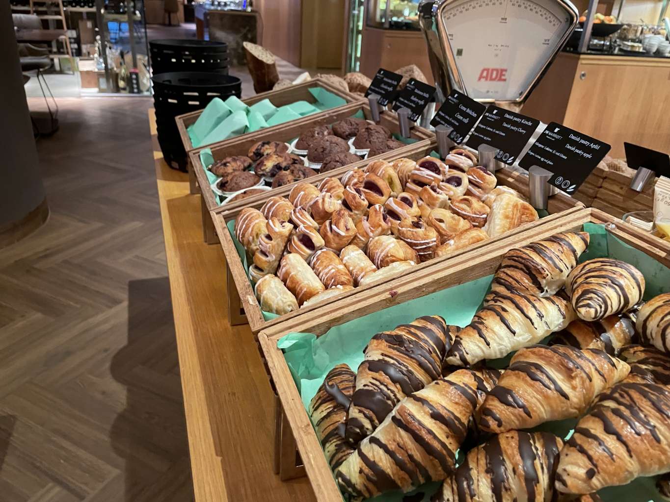 Das Büffet-Frühstück hat zunächst einmal einen eigenen Bereich mit einer großen Auswahl an Brot und Brötchen sowie süßem Gebäck. An einem zweiten Tisch gibt es dazu noch warme Croissants und Toast.