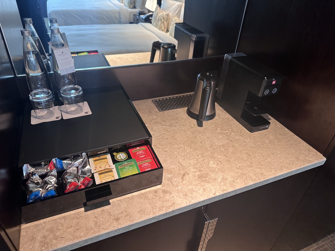 Zur Ausstattung gehören u.a. Wasserkocher, Espressomaschine, Kühlschrank und ähnliche Dinge, die in einem solchen Hotel erwartet werden dürfen.