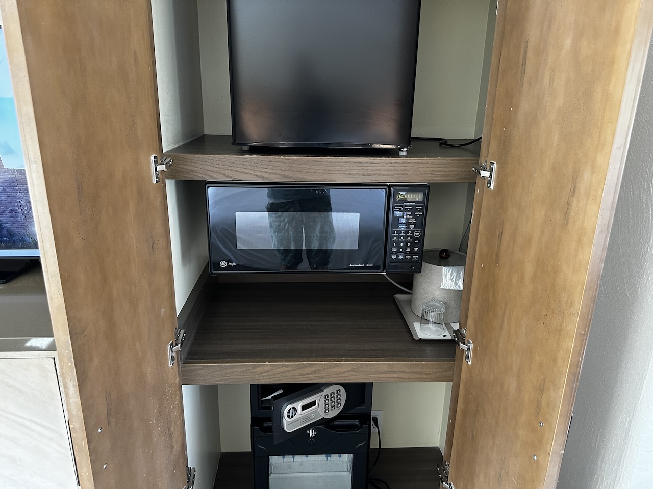 Es gab gleich zwei Kühlschränke, eine Kaffeemaschine und eine Mikrowelle. Im Durchgang zum Badezimmer war der große Kleiderschrank.