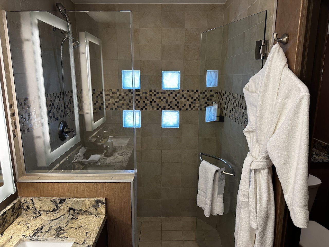 Im Bad war eine abgetrennte Toilette und eine riesige Dusche. Die Terrasse war groß, aber etwas kahl. Diese könnte man mit wenig Aufwand etwas idyllischer gestalten. Dennoch haben wir uns natürlich über diesen Luxus gefreut.