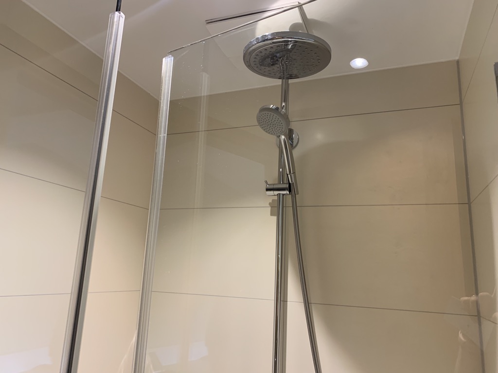 Unser Standardzimmer befand sich im zweiten Stockwerk. Direkt nach dem Betreten links befand sich das Badezimmer. Dieses war mit einer Dusche mit Regenduschkopf, einem Waschbecken und einer leicht abgetrennten Toilette ausgestattet. Neben ausreichend vielen Handtüchern begrüßten uns auf der Ablage neben dem Waschbecken auch noch Amenities.