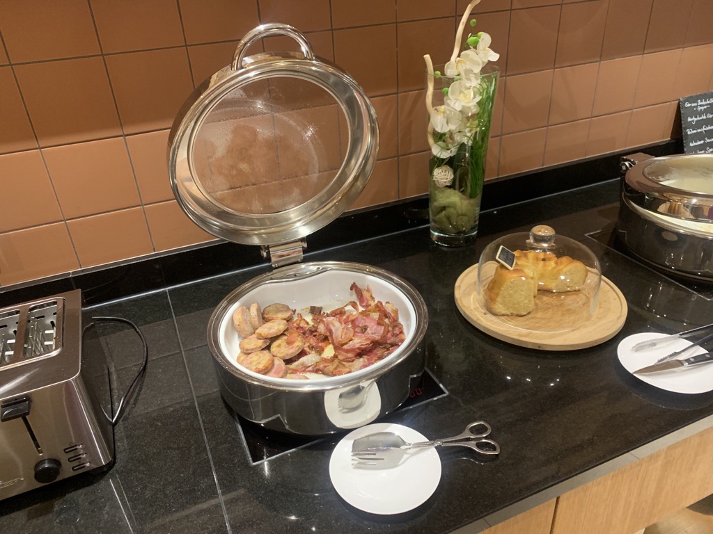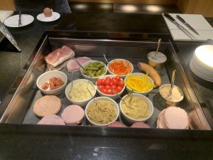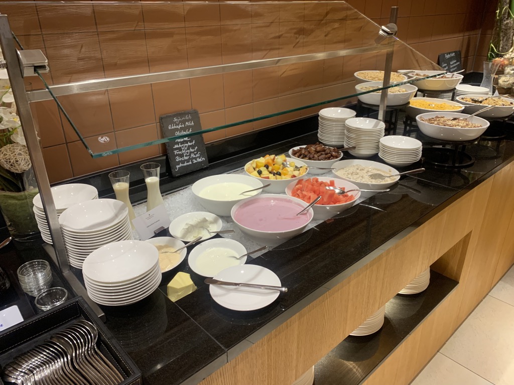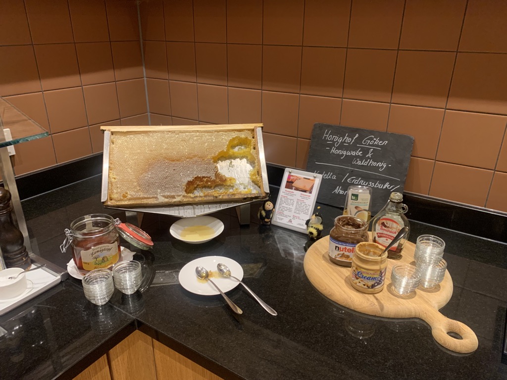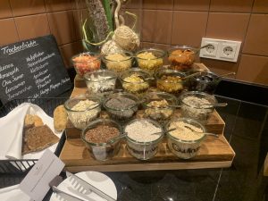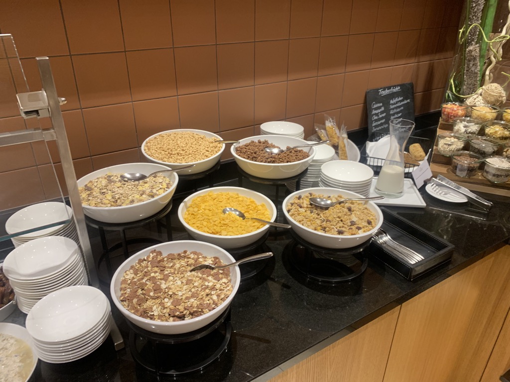 Das Angebot hat keine Wünsche offen gelassen. Neben verschiedenen Sorten Brot und Brötchen gab es Aufschnitt, Müsli, Joghurt, Säfte, Lachs und noch viel mehr. Besonders toll fand ich, dass auf dem Buffet einige pfälzischen Spezialitäten zu finden waren. Insgesamt machte alles einen sehr frischen Eindruck und wurde regelmäßig aufgefüllt