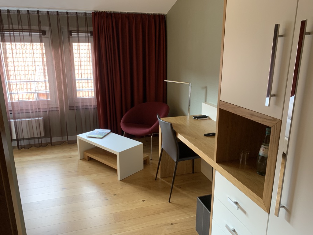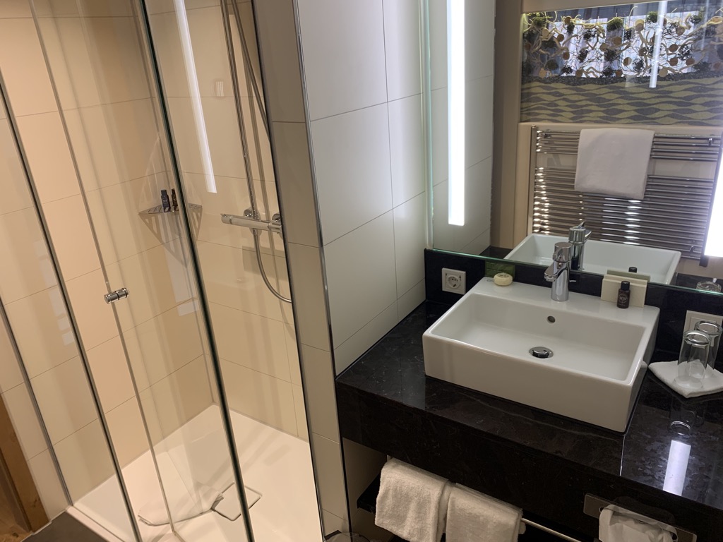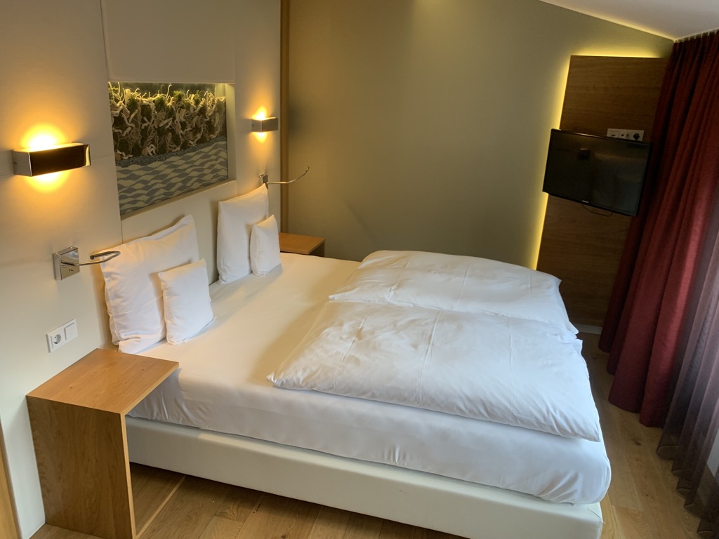 Zentrales Element des Zimmers war natürlich das großzügige Bett, auf welchem wir wunderbar geschlafen haben. Was Sebastian bemängelt, möchte ich positiv hervorheben. Ich freue mich immer, wenn jeder seine eigene Decke hat. Beim Schlafen brauche ich Freiraum und niemanden, der mir durchs Drehen die Decke klaut ;). Neben dem Bett stand noch ein kleiner Schreibtisch, an dem man arbeiten konnte sowie ein kleiner Sessel mit Couchtisch.