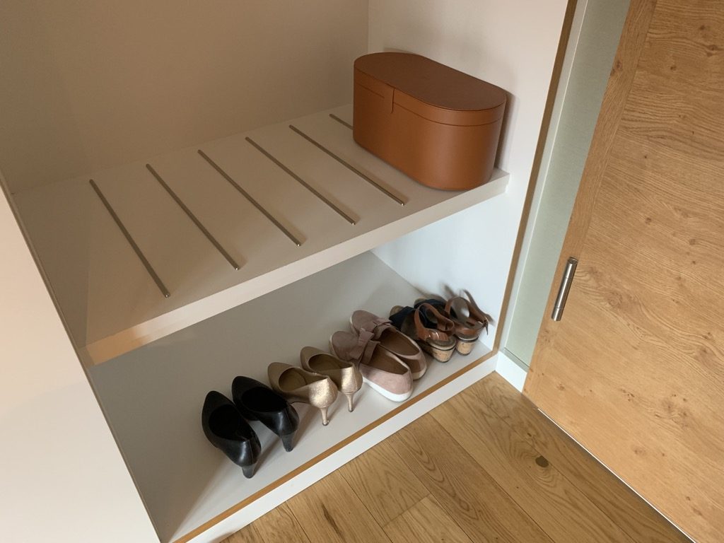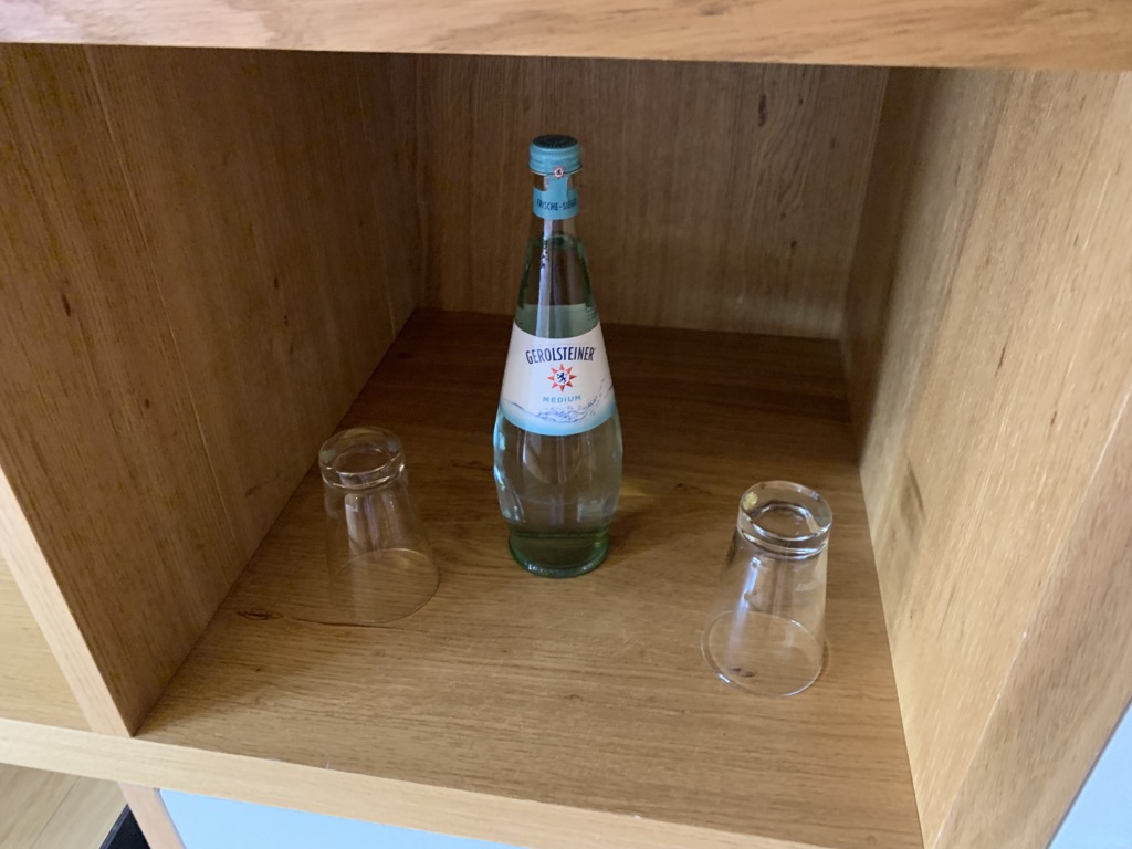 Gegenüber des Badezimmers befand sich der Schrank. Wo sich in anderen Hotels eine Kaffee- und Teestation befindet, stand hier eine große Flasche Mineralwasser. Keine schlechte Idee Ende August.