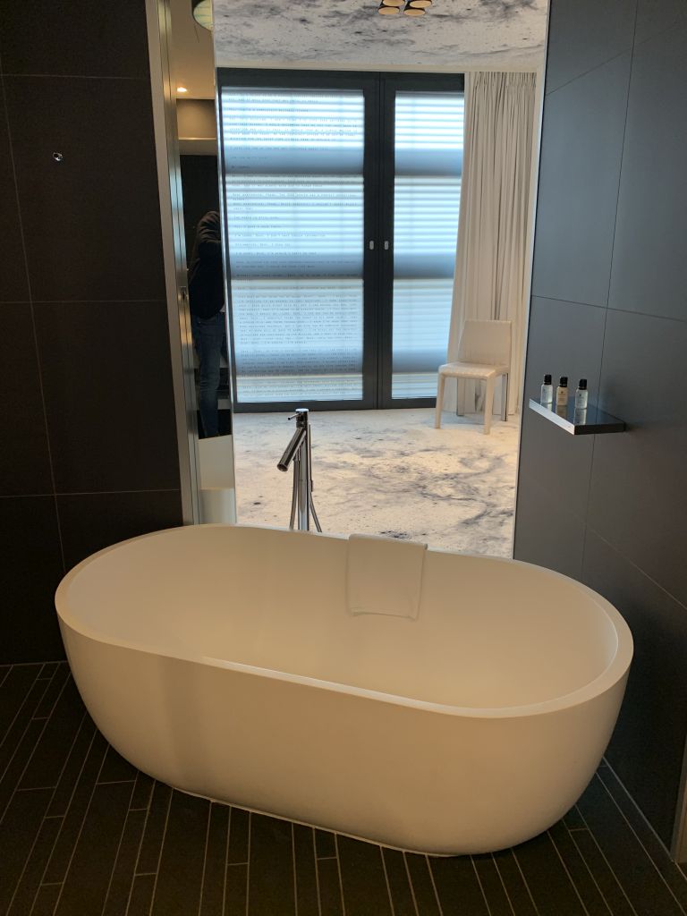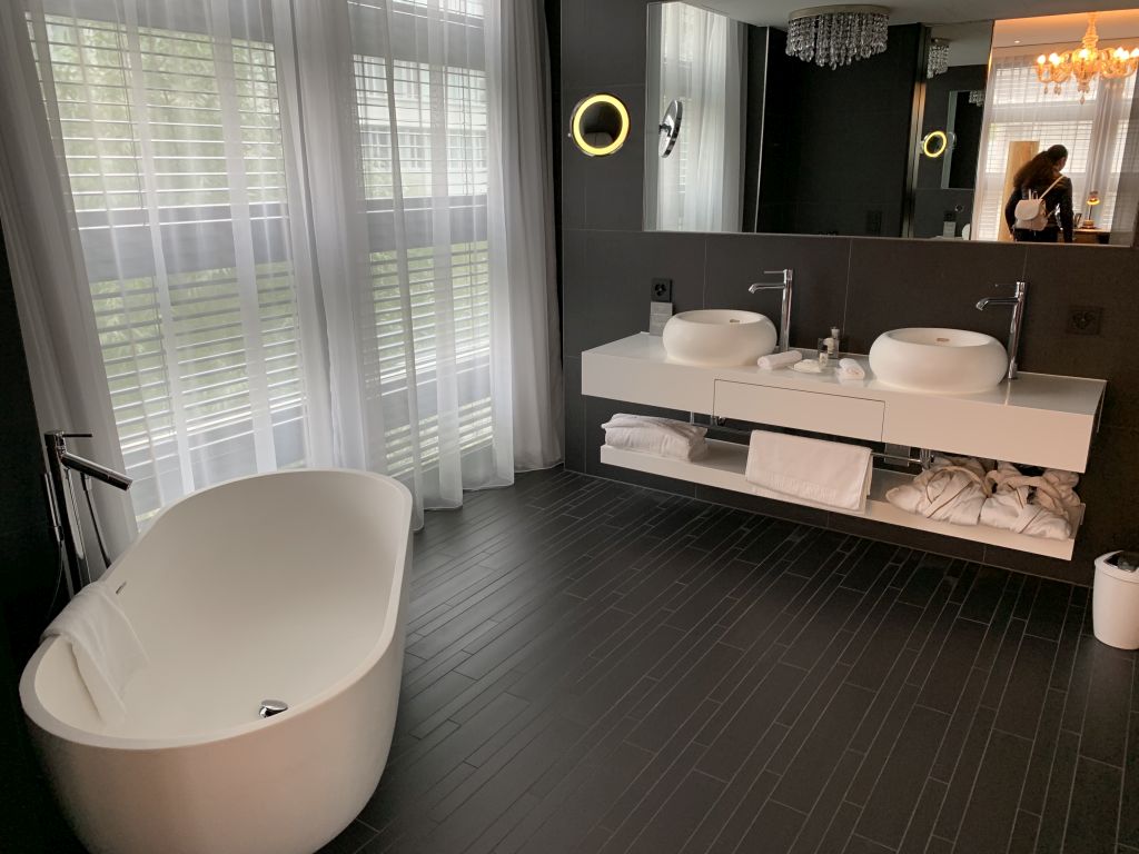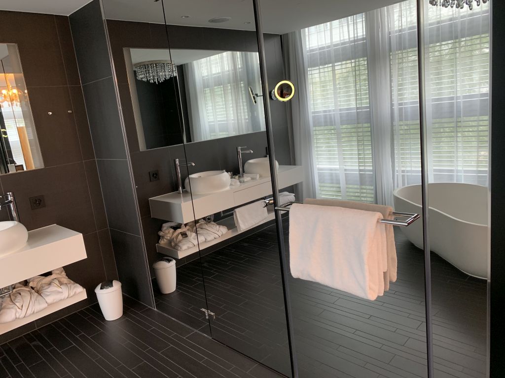 Hinter dem Vorraum zur rechten Hand befand sich das Badezimmer. Eine frei stehende Badewanne war zur großen Fensterfront ausgerichtet. Direkt vor Kopf hatte die Suite einen großen Waschtisch mit zwei Waschbecken und riesigem Spiegel. Versteckt hinter eine verspiegelten Wand verbarg sich das WC und hinter einer zweiten Tür die Dusche.