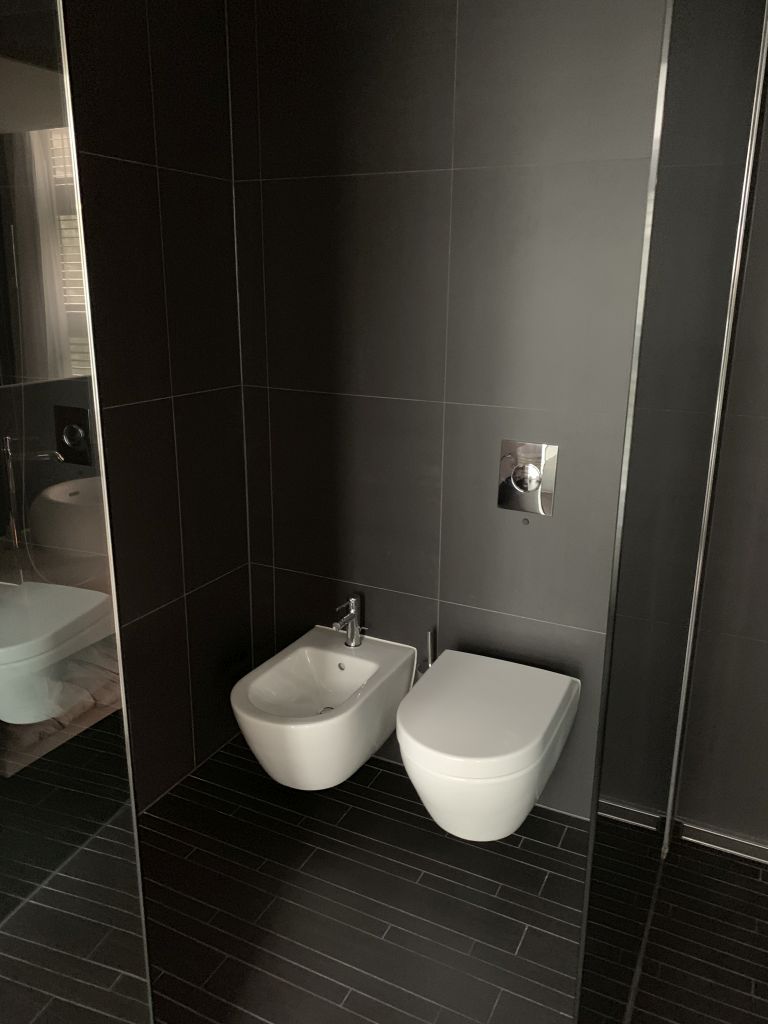 Vom Flur abgehend befindet sich zunächst das Bad, welches sich durch Schiebetüren in zwei Richtungen öffnen lässt. Auch hier gibt es eine freistehende Badewanne und ein Waschtisch mit zwei Becken und einem großen Spiegel. Die Zugänge zur Toilette und Dusche verbergen sich auch hier hinter verspiegelten Türen. Als zusätzliches Gimmick kann man die Dusche als Dapfbad nutzen.