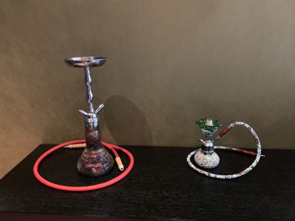 Als wir die Suite betraten, staunten wir zunächst mal über den großzügigen Vorraum, in dem auch eine kleine „Küche“ mit Waschbecken und Kühlschrank untergebracht ist. Außerdem steht hier eine Nespresso Kaffeemaschine und als Special dieser Suite befanden sich auf einer Kommode zwei Wasserpfeifen.