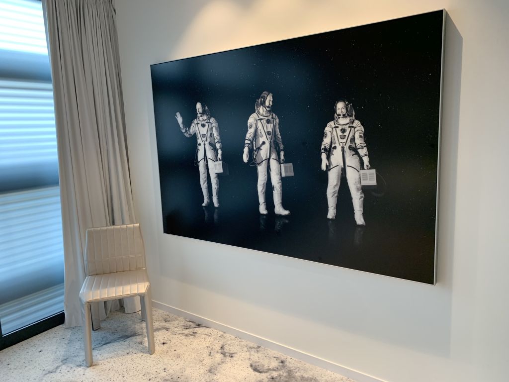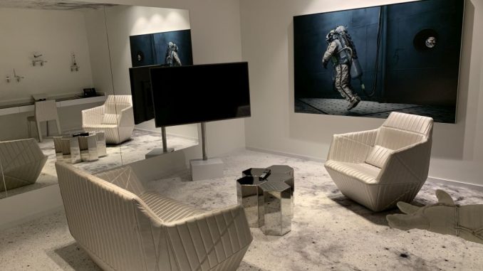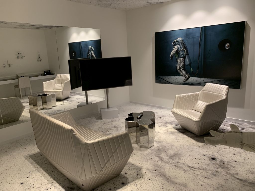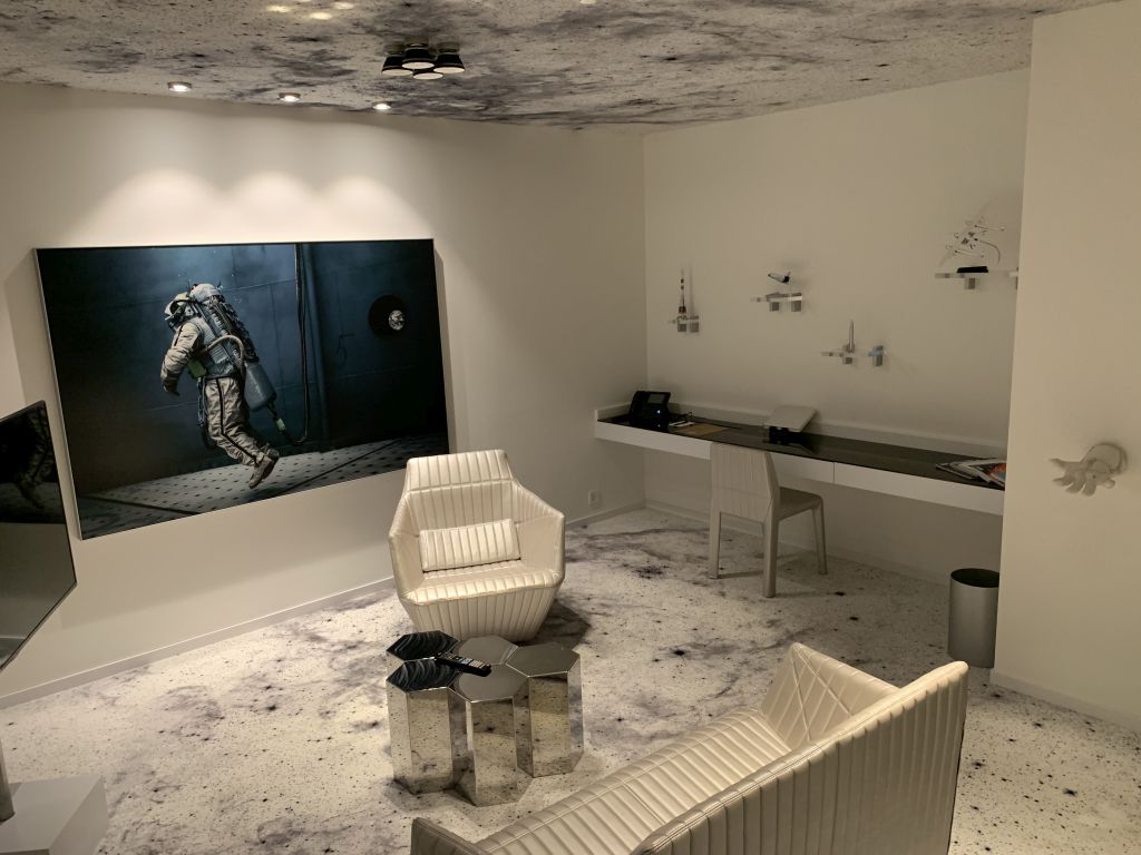 Der Wohnbereich der Suite befindet sich am Ende des Ganges. Dieser wird dem Space-Thema ebenfalls voll gerecht. Spacige Lounge-Möbel, ein aus Sechsecken bestehender silberner Couchtisch, sowie mehrere Raumfahrt-Modelle und die passende Literatur durften nicht fehlen.