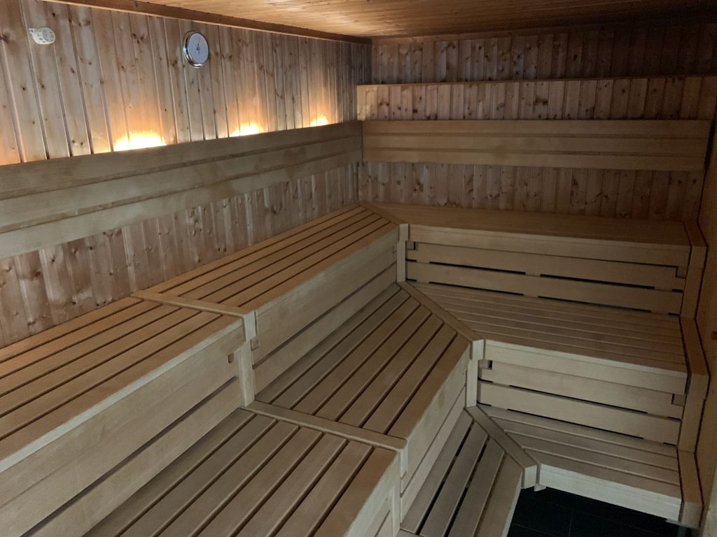 Zu unserer Entspannung stehen eine 60 Grad und eine 90 Grad Sauna bereit. Beide ermöglichen durch die Glasfront Einblick in den Sauna-Bereich und Richtung Fenster. Zusätzlich gibt es noch ein Dampfbad, drei Duschen und mehrere Becken für ein Fußbad.