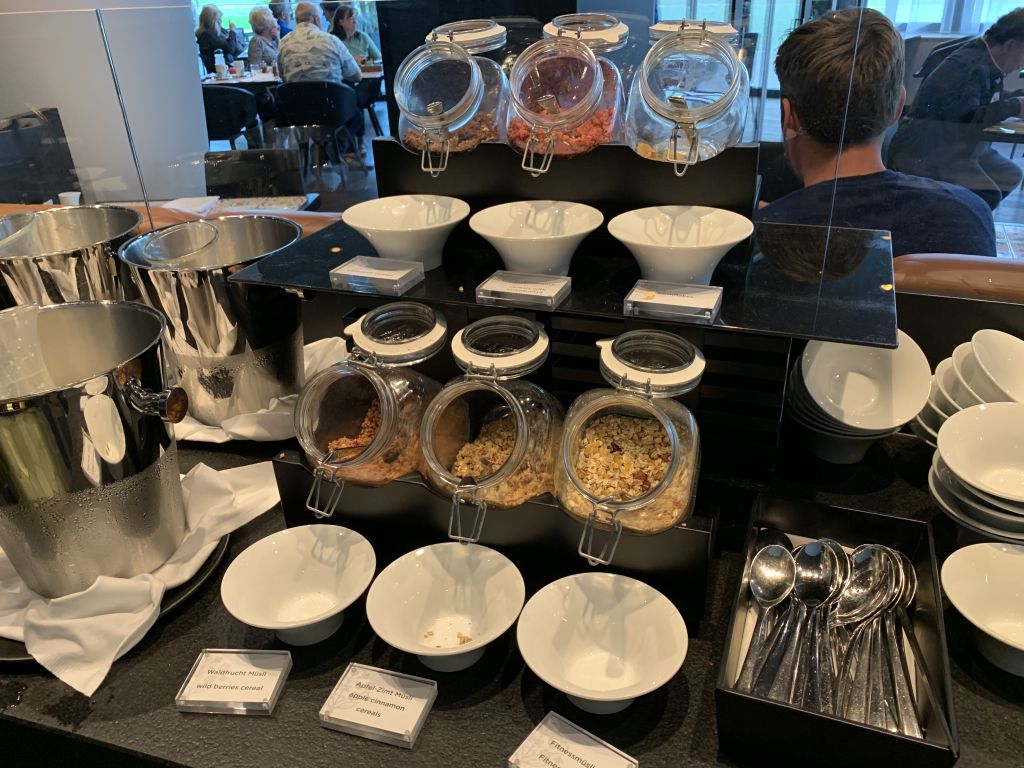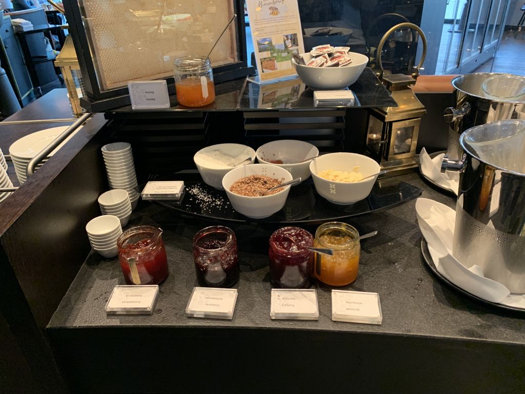 Daneben gab es kalte Platten mit Lachs, Wurst, Obst und verschiedenen Käse-Sorten, sowie eine Auswahl an Marmeladen und Frühstücks-Cerealien.