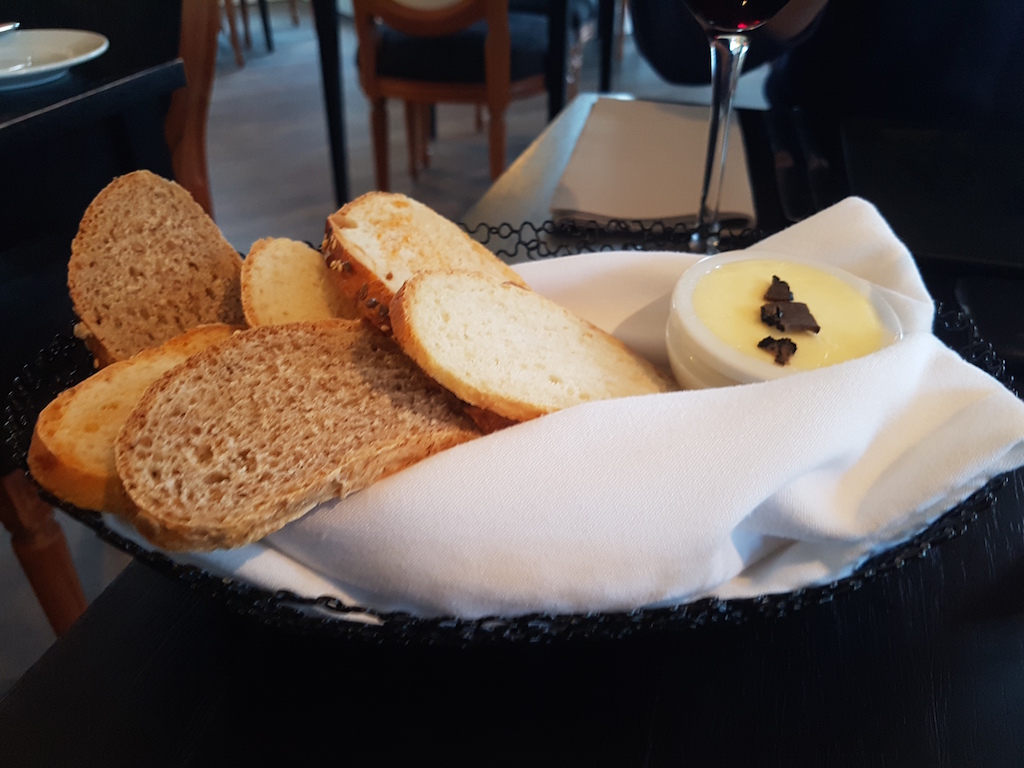 Wir haben kurz nachdem wir Platz genommen haben, die Speise- und Weinkarte überreicht bekommen. Direkt im Anschluss wurde der Gruß aus der Küche (Hummersalat mit Kaviar) und ein Brotkorb serviert.