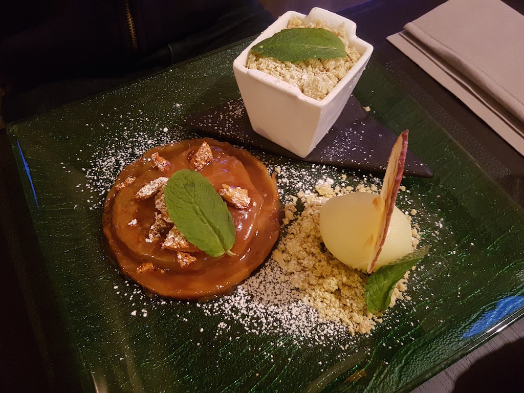 Da wir dann doch recht satt waren, haben wir uns noch ein Dessert geteilt. Neben einem warmen Apfelkuchen, wurde Sorbet und einen Butter Scotch Toffee serviert. Absolut lecker und von der Portion genau richtig.