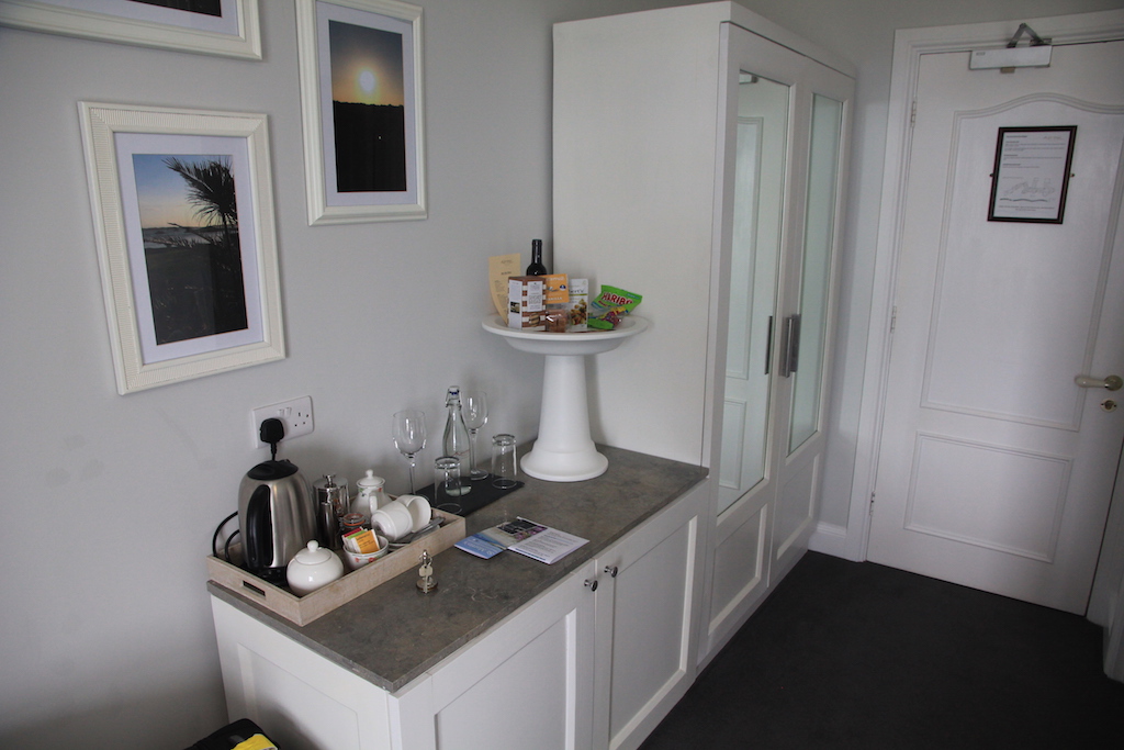 Im Eingangsbereich gegenüber des Badezimmers befindet sich ein großer Kleiderschrank. Hier lassen sich bequem die Koffer verstauen. Daneben steht eine Kommode in der die Minibar untergebracht ist. Im Zimmer gibt es zudem kostenfreies Wasser, sowie Kaffee und Tee, die mit dem Wasserkocher zubereitet werden können.