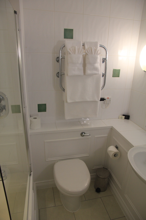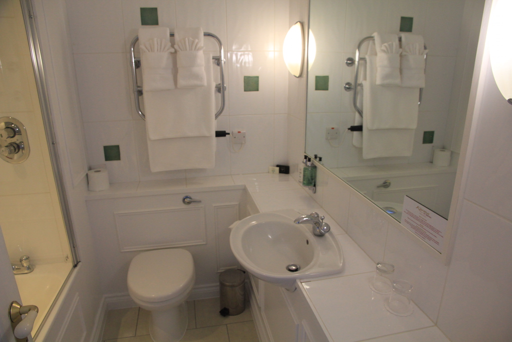 Das Zimmer ist von der Größe recht übersichtlich, aber sehr gemütlich. Das liegt vor allem an der Bauart des Gebäudes. Links vom Eingang befindet sich das Badezimmer. Dies verfügte über eine Badewanne mit Dusche, eine Toilette sowie ein Waschbecken auf der rechten Seite. Positiv fällt die große Ablagefläche auf. Negativ sind leider die Seifenspender. in einem Viersterne-Haus macht dies nicht viel her.