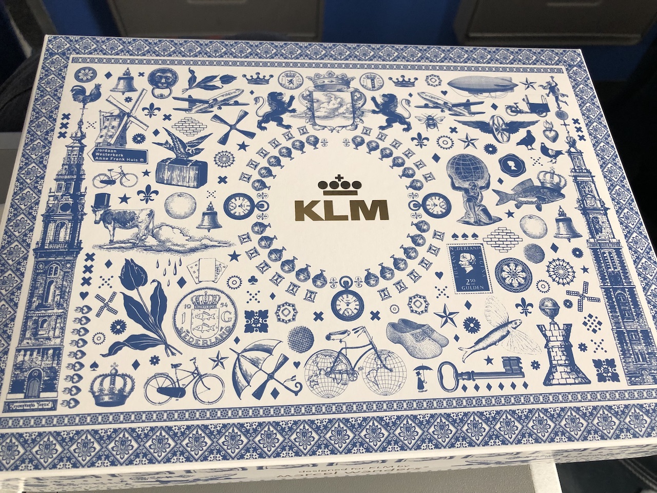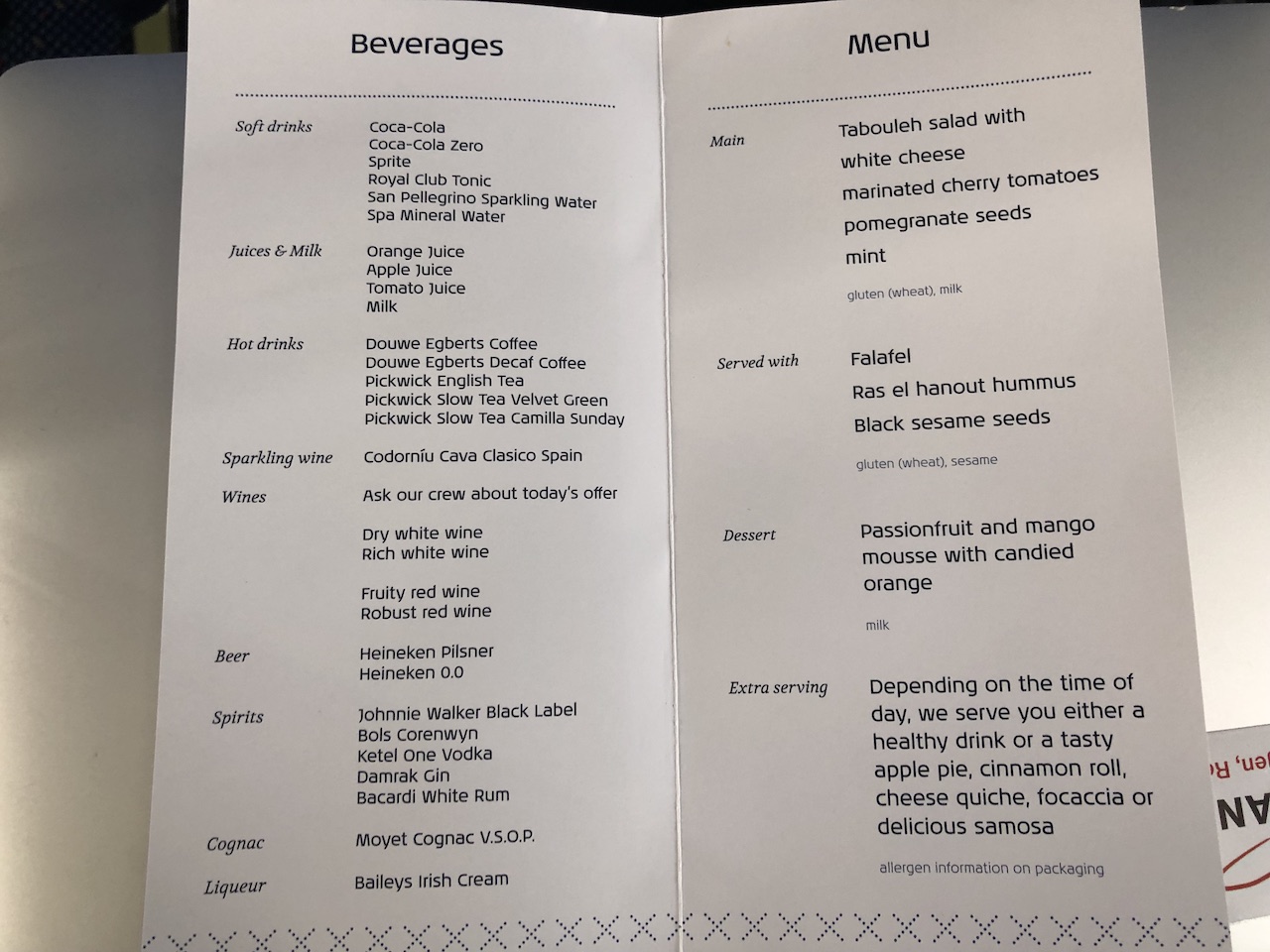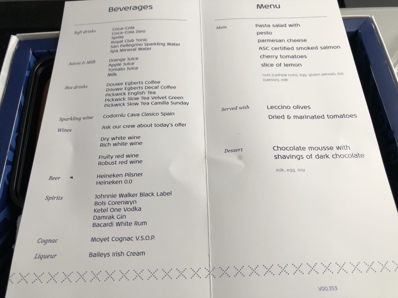 Pünktlich ging es in Richtung Startbahn, der knappe Anschlussflug wurde nicht gefährdet. In der Luft wurde uns relativ schnell eine Kartonbox im auffälligen Design serviert und Getränke abgefragt. In der Box befindet sich eine Speisekarte, die auch über das Getränkesortiment imformiert.