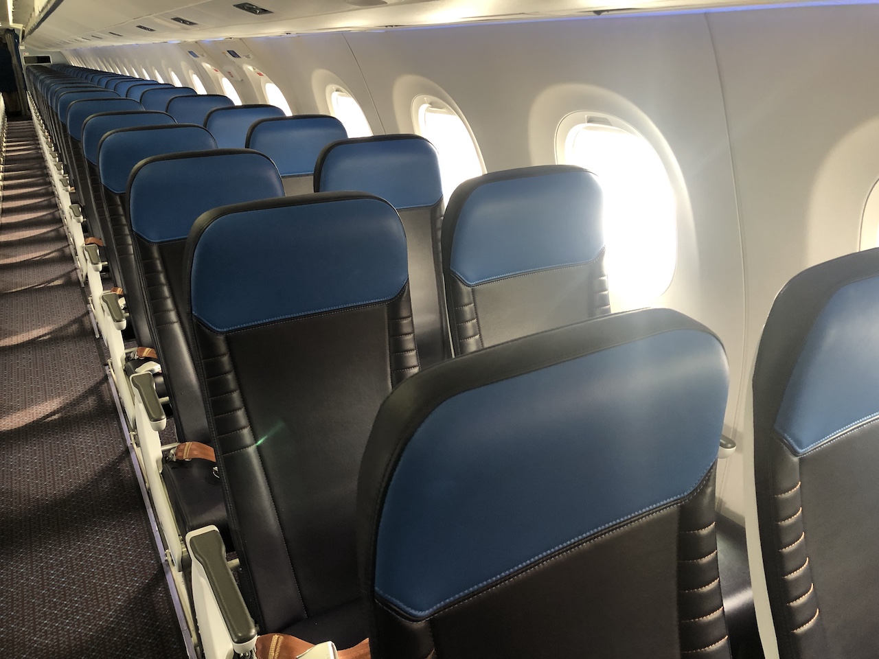 Im Vergleich könnt Ihr hier rechts die Sitze im E2-Jet sehen, das Design der Europaflotte wurde modernisiert und ist auch in immer mehr Boeing 737 Flugzeugen zu finden.