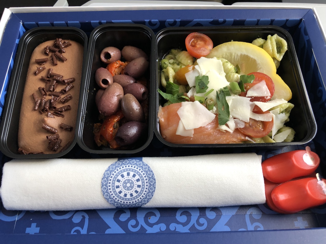 Die bekannte Box wurde wieder schnell serviert, diesmal ein Nudelsalat mit Oliven und Dessert. Das Essen war wirklich schmackhaft und für die jeweils kurzen Flüge ausreichend.