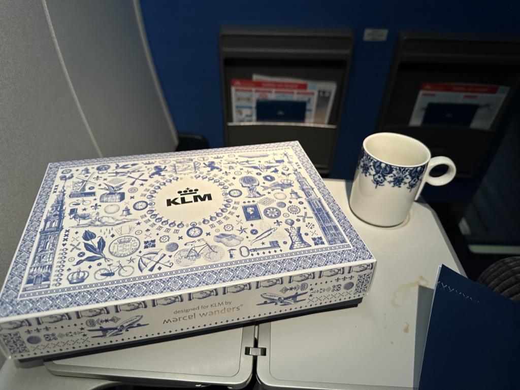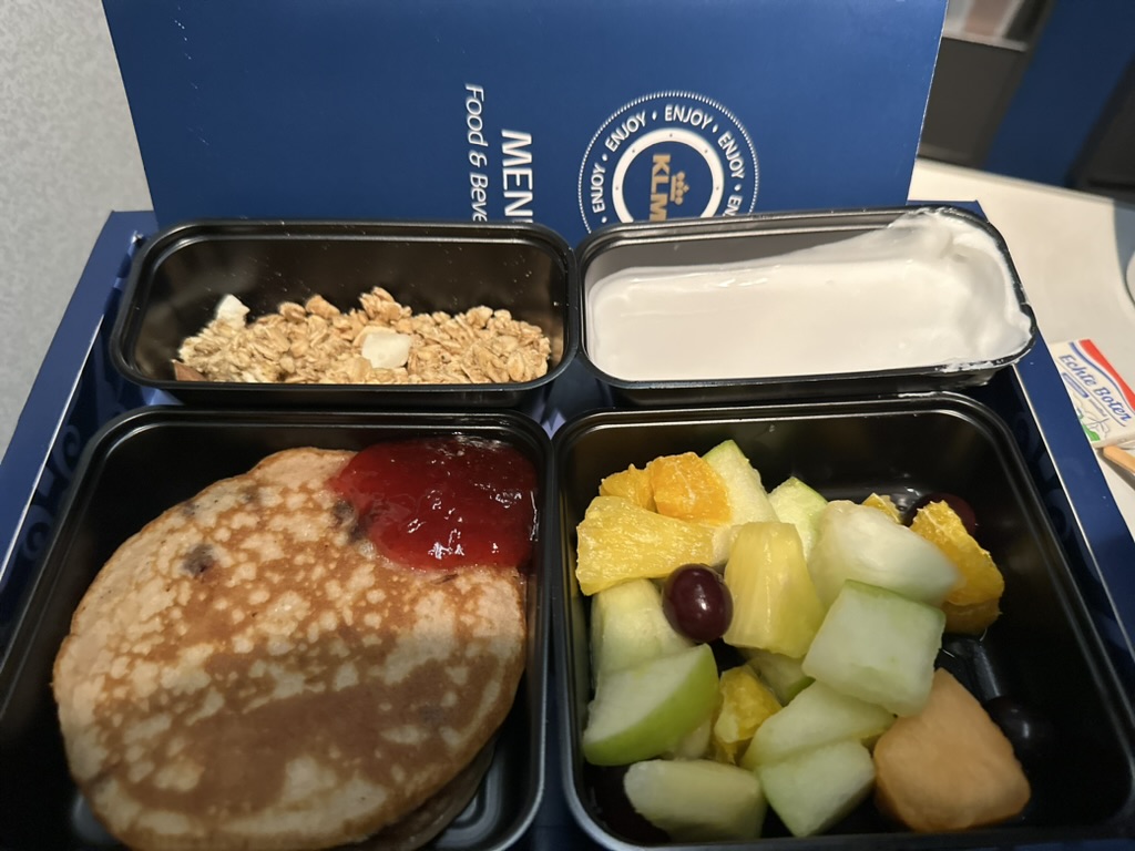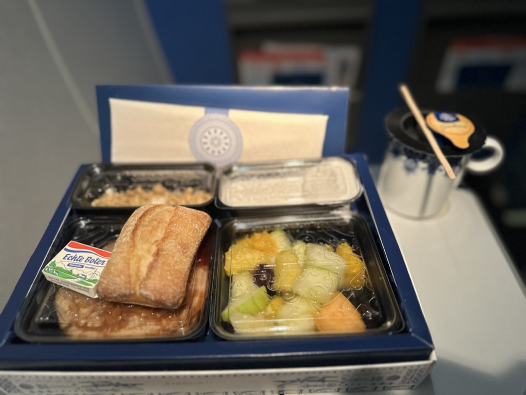 Ich freute mich über die glückliche Fügung, da ich noch keinen Kaffee hatte und es nicht mehr in die Nürnberger Dürer Lounge geschafft hatte. Business Class bedeutet Frühstück, wobei KLM auch in der Economy Class Getränke und sogar einen Snack anbietet.