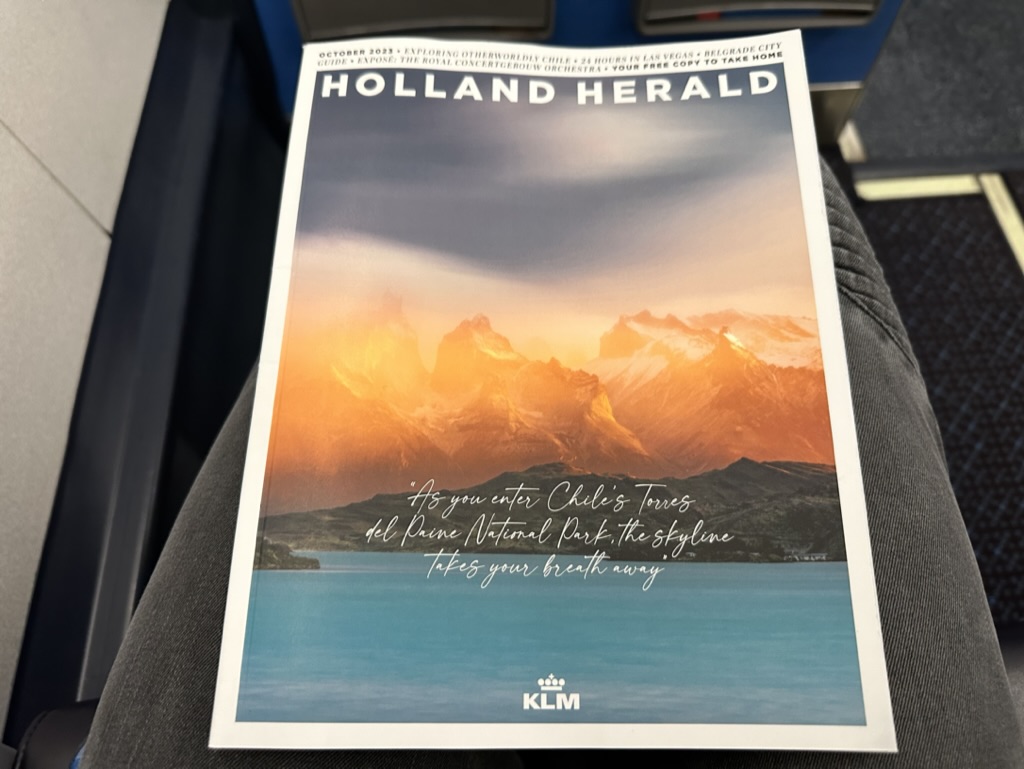 Noch am Boden wurden Wasserflaschen verteilt. KLM bietet sogar noch ein Bordmagazin, eine gute Gelegenheit sich die Zeit zu vertreiben bis es los geht.