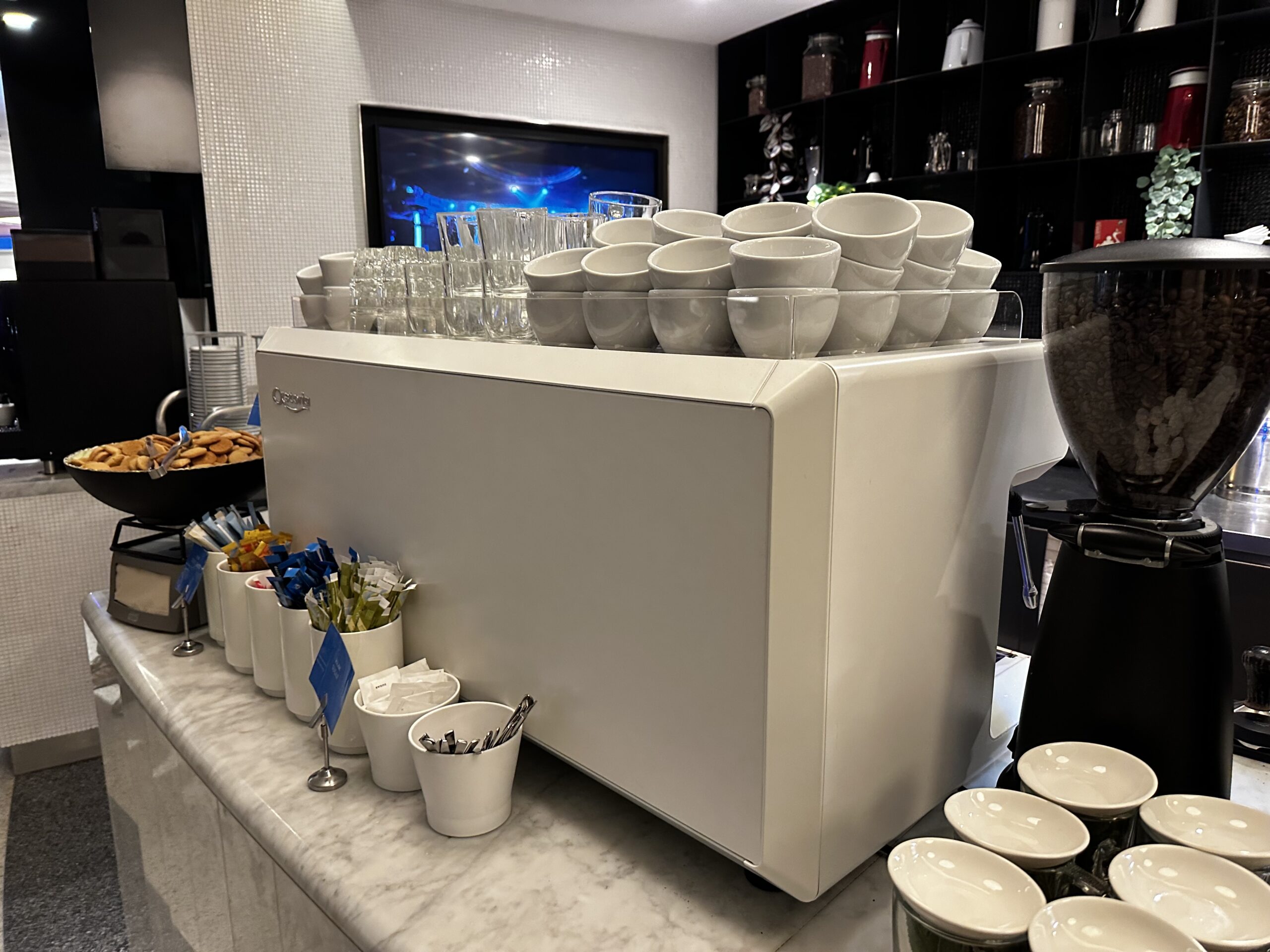 Neben den Robotern kümmern sich natürlich auch Menschen um Ordnung, ich kenne die Lounge eigentlich nur sauber und aufgeräumt. An einer Station gibt es auch Barista-Kaffee, sonst kann man die vielen Vollautomaten nutzen.