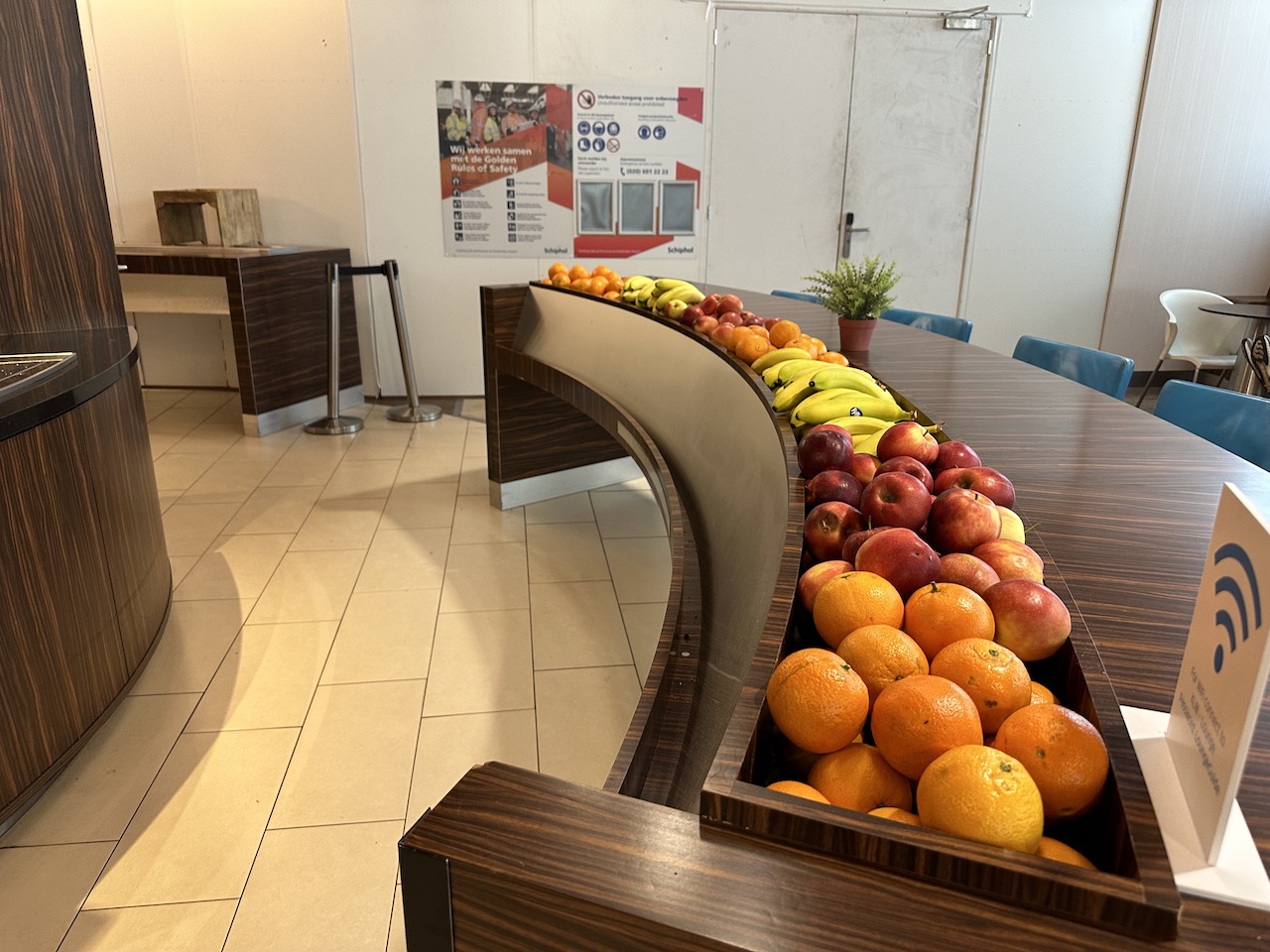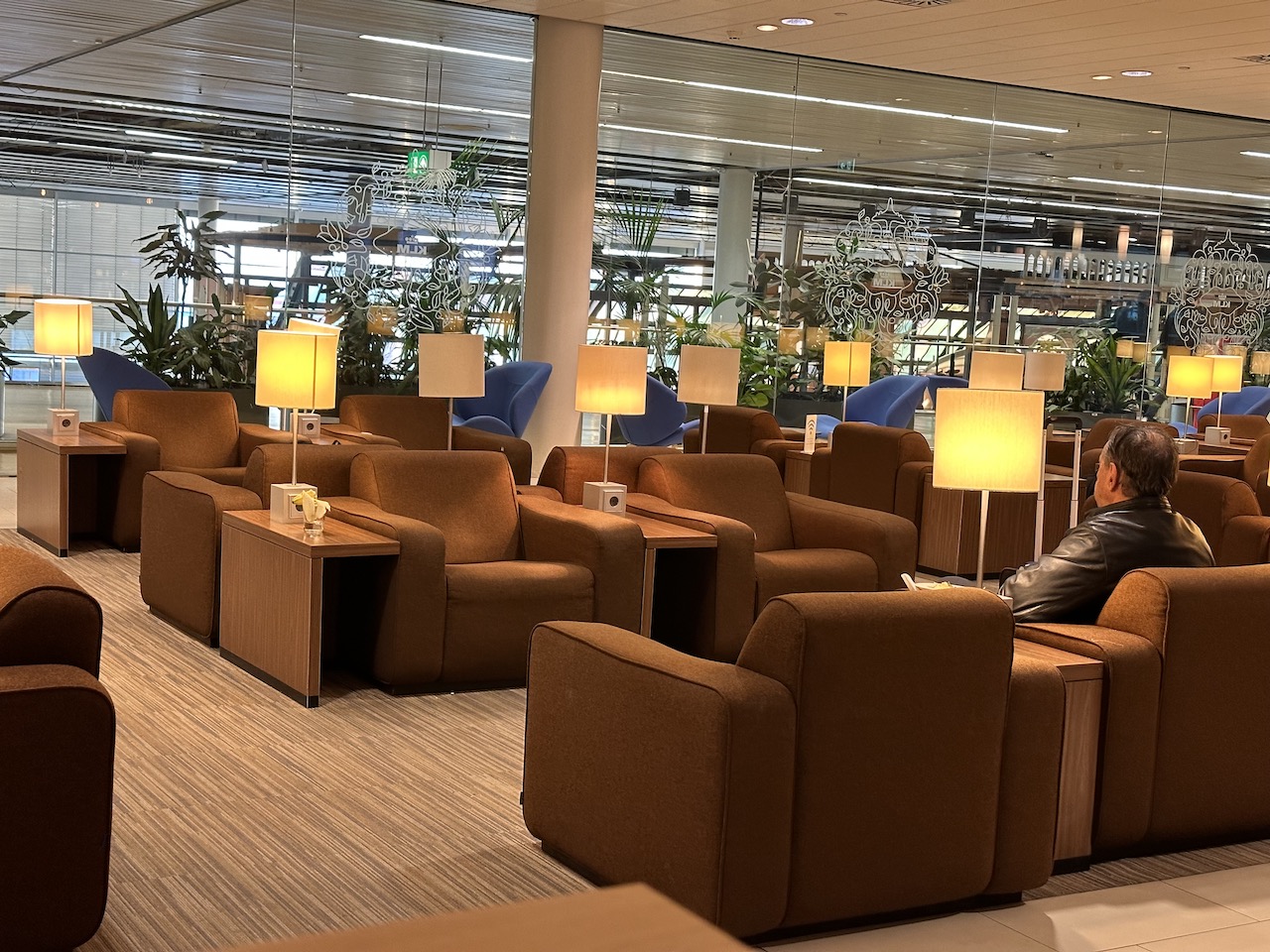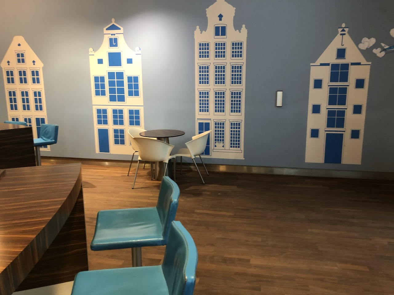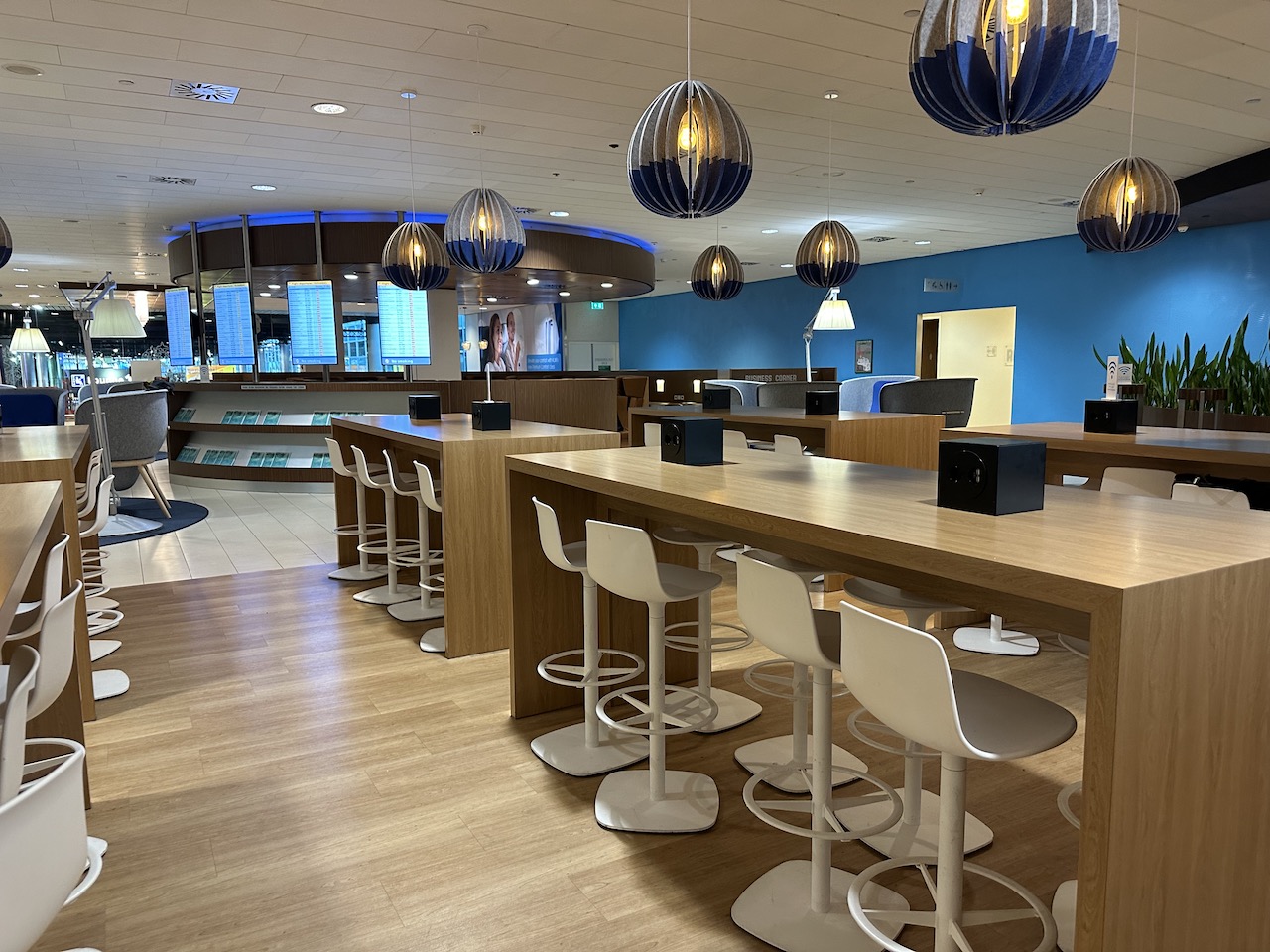 KLM ist eine riesige Airline, am Hub in Amsterdam muss also etwas geboten werden. Die Räumlichkeit könnte durchaus etwas größer sein, Stoßzeiten gibt es mehrfach täglich, dann wird es ganz schön voll. Immerhin kann man sich in einigen Ecken entfernt vom Buffet meist noch einen ruhigeren Platz schnappen.