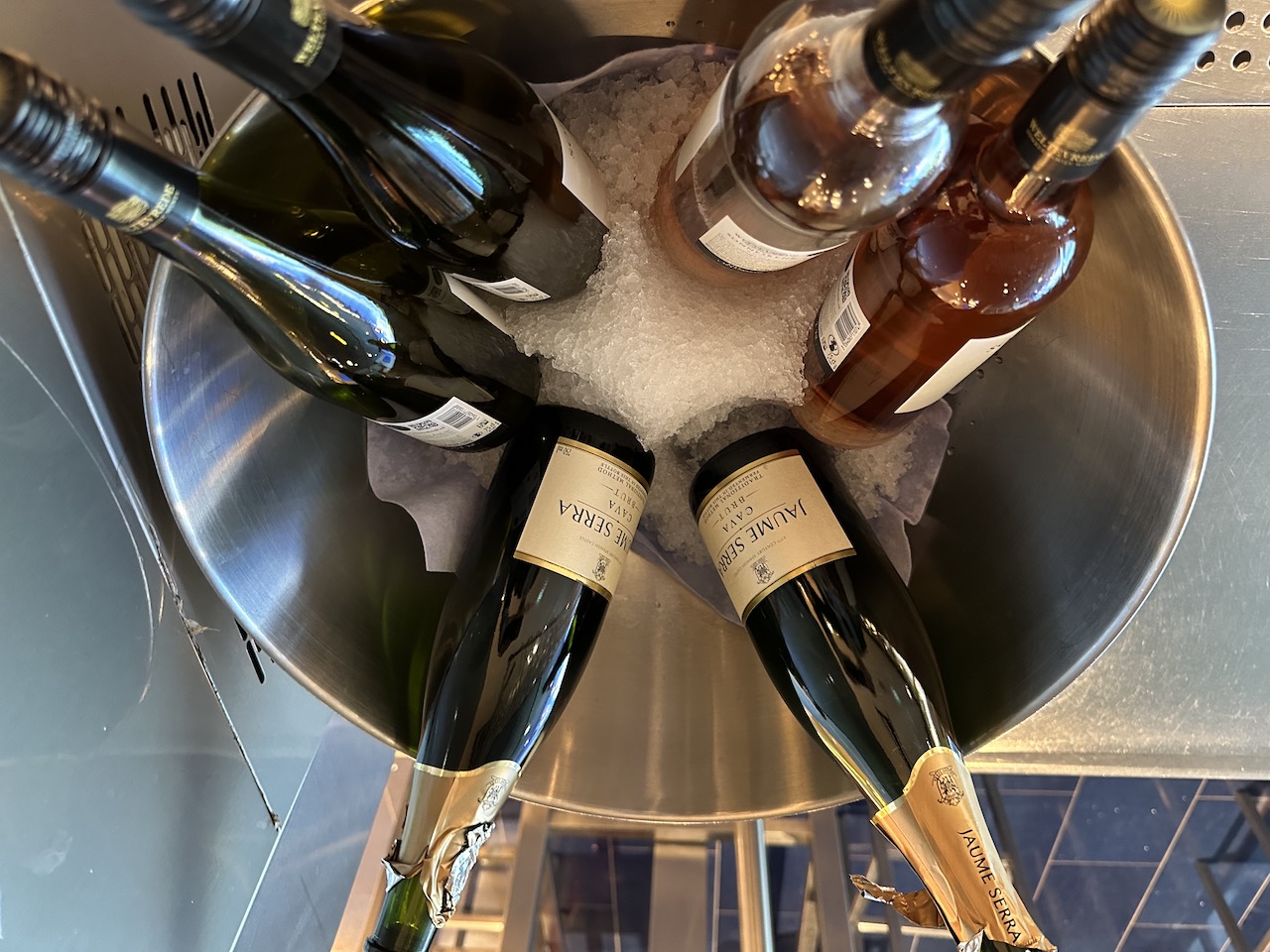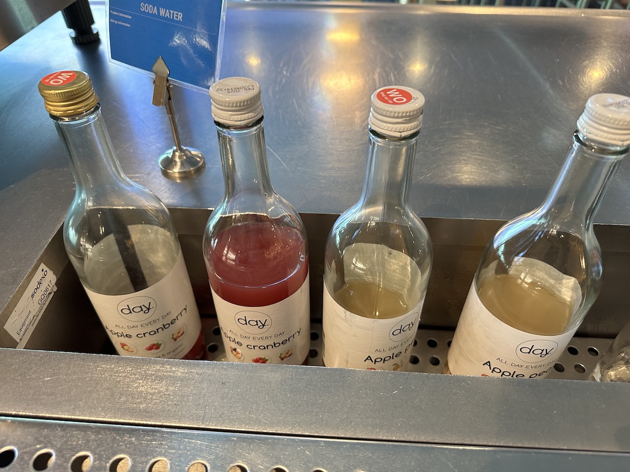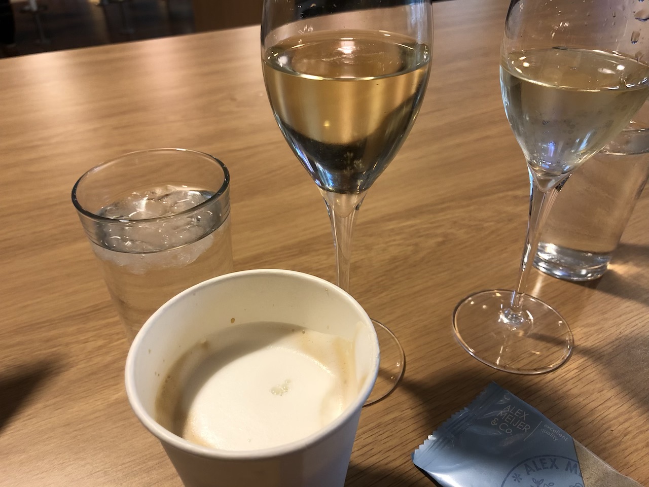 Getränke kann man sich selbst holen, der Kaffee aus dem Automaten war akzeptabel. Durch die drei Kaffeestationen gab es weniger Gedränge als am Essensbuffet. Das restliche Getränkesortiment war durchschnittlich, neben Softdrinks waren Säfte, Wein und Cava verfügbar.