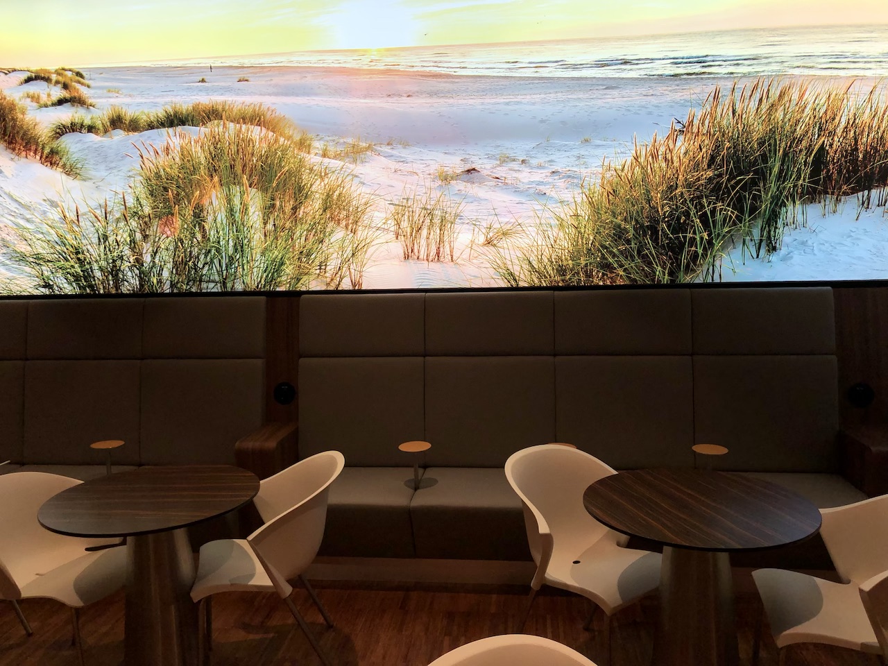Die Sitzmöglichkeiten sind in Ordnung . Man hat einen Blick zum Flughafengang wo sich viele Menschen bewegen und sonst seht man Bilder von holländischen Landschaften. Man hat kein natürliches Licht.