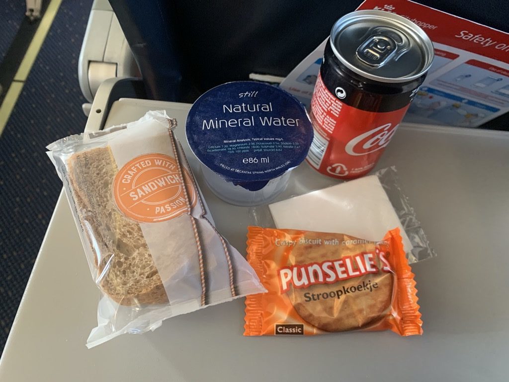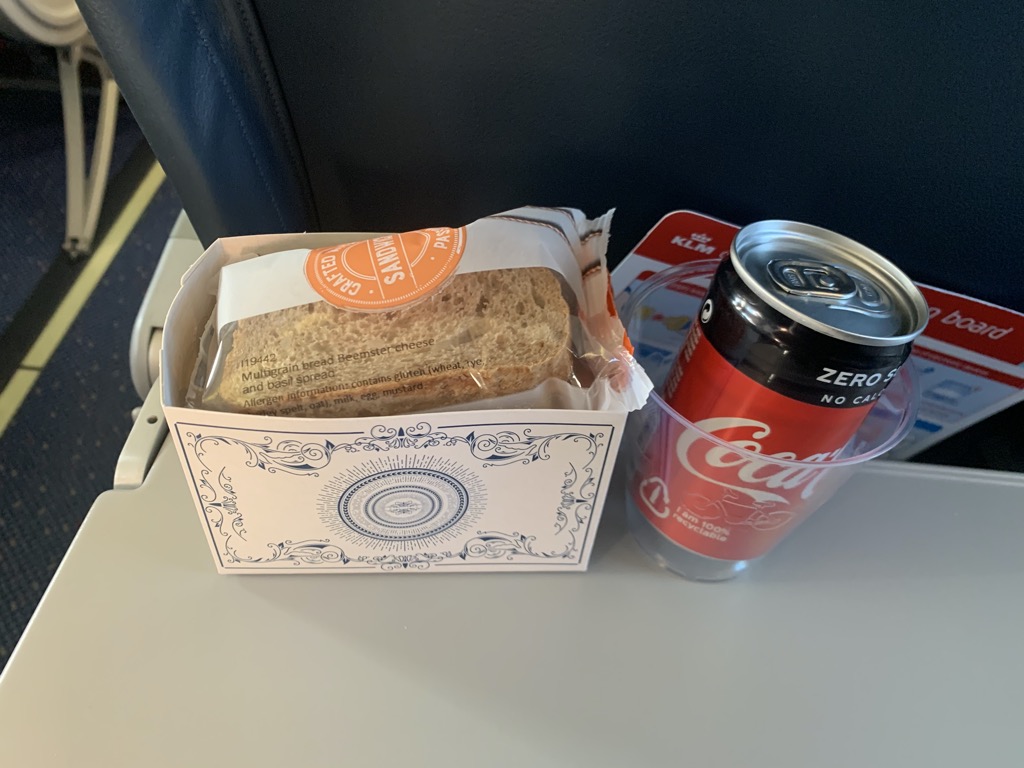 Nach dem Start haben die Flugbegleiter direkt mit dem Service begonnen. Hierbei bietet KLM den vollen Service, den man auch vor der Pandemie angeboten hat. So wurde eine kleine Box mit einem Sandwich, einem Keks und Wasser erreicht. Zusätzlich gab es einen Getränkewagen mit der vollen Auswahl an alkoholfreien und alkoholischen Getränken.