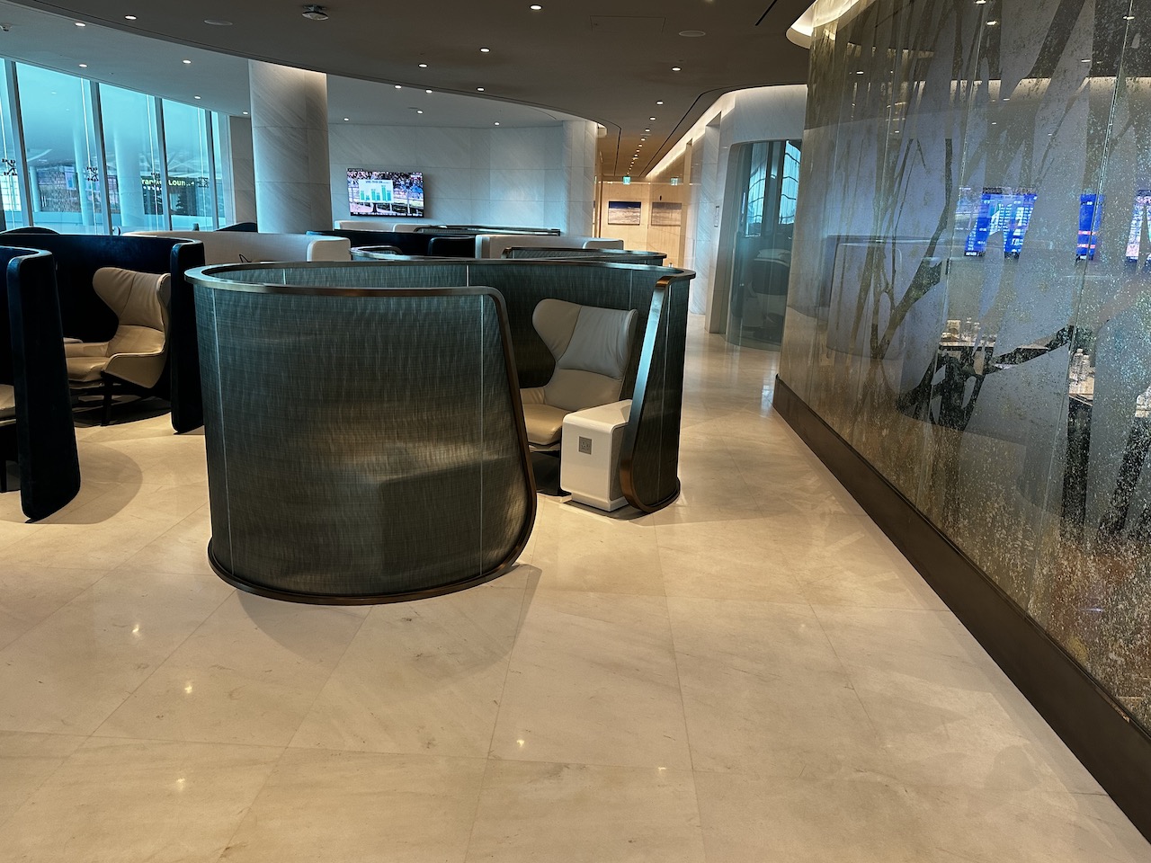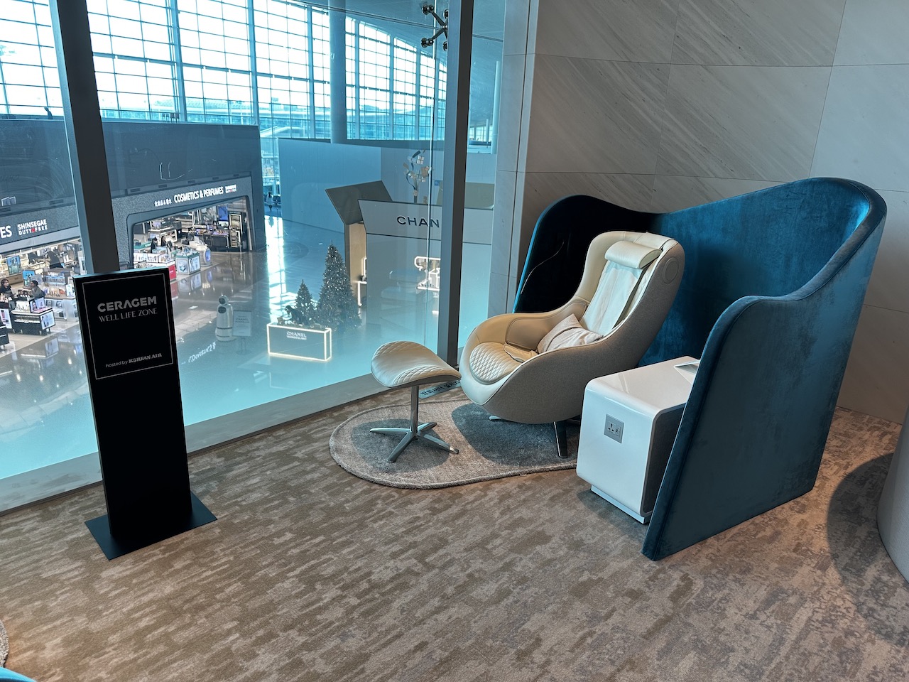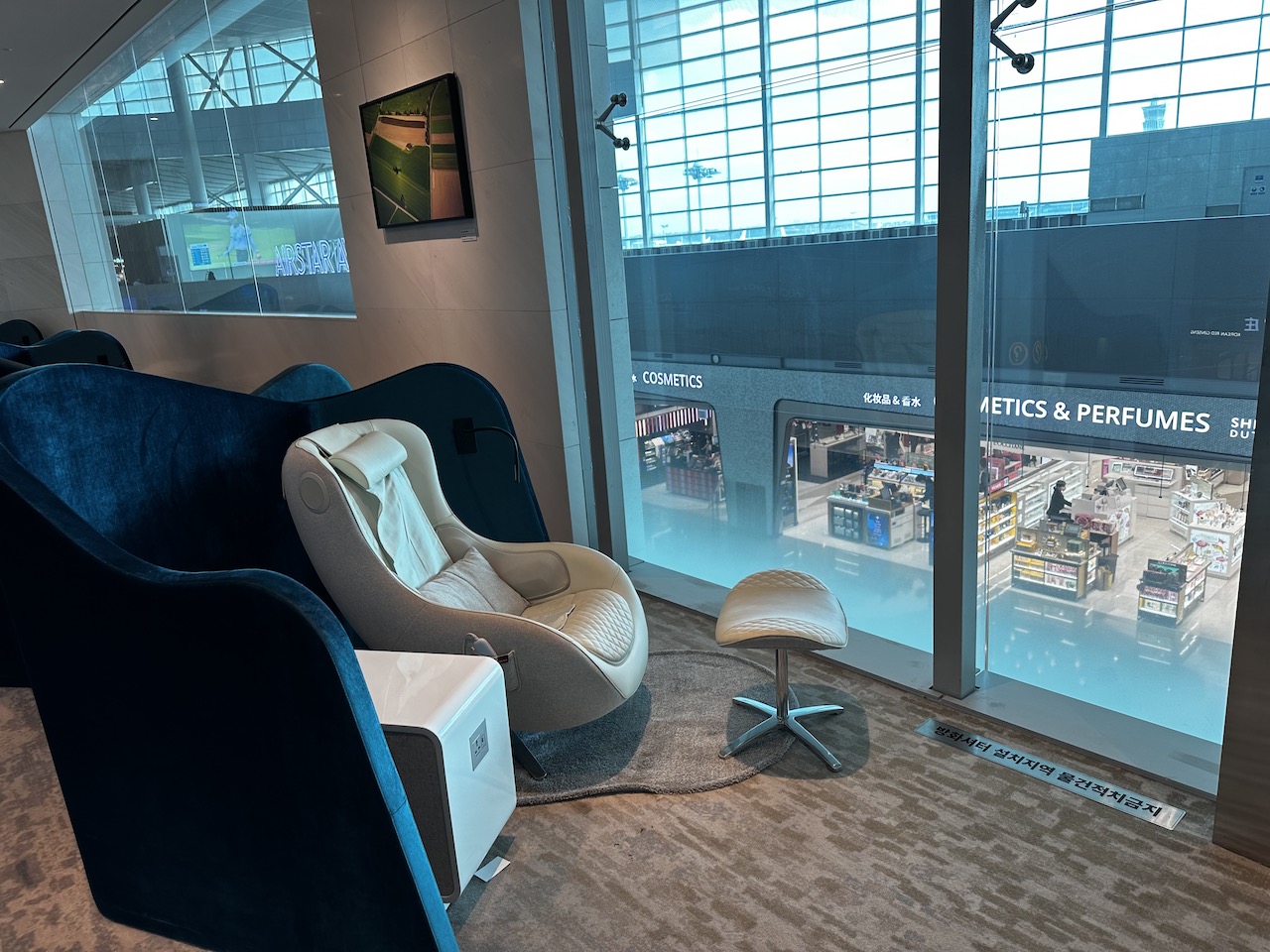 Wie in allen KAL Lounges sind auch hier die Massagesessel vorhanden, alle Sitze sind etwas abgeschirmt. Aus dem Fenster kann man ins Terminal blicken.