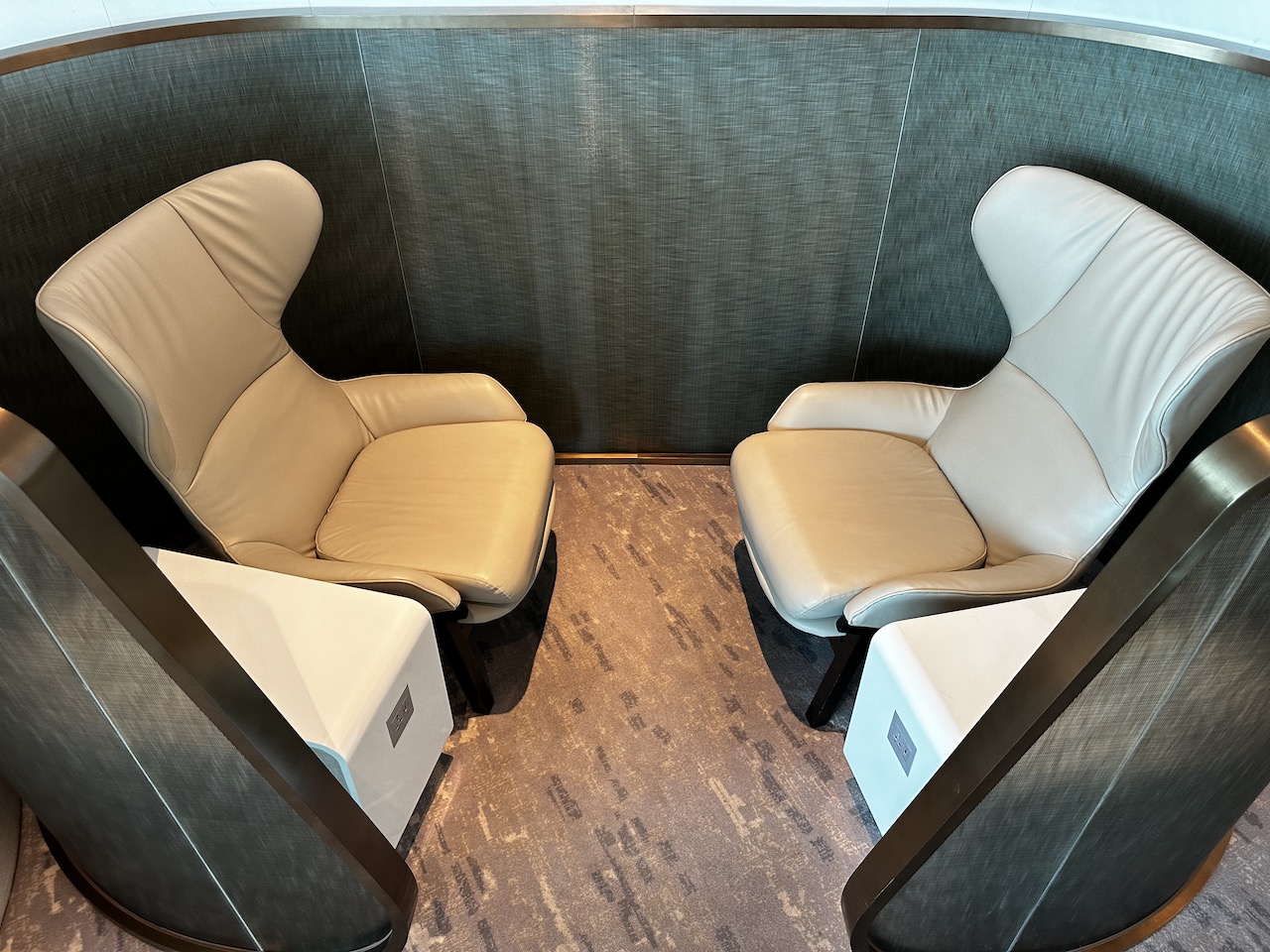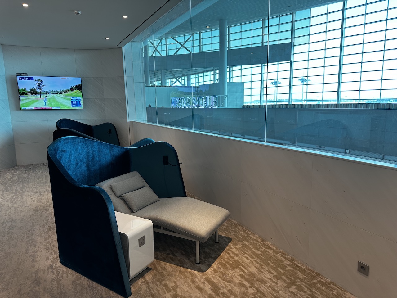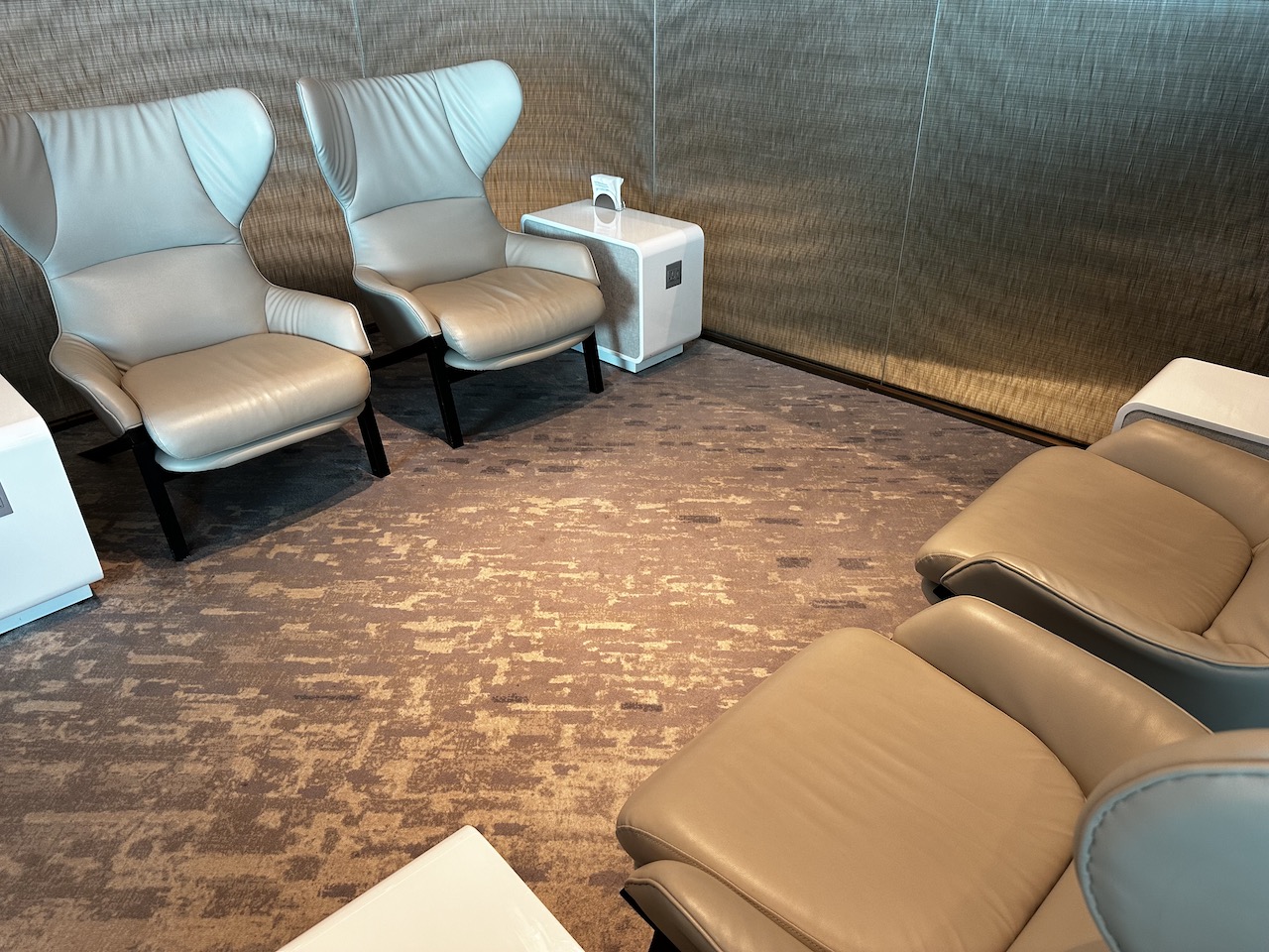 Wie in allen KAL Lounges sind auch hier die Massagesessel vorhanden, alle Sitze sind etwas abgeschirmt. Aus dem Fenster kann man ins Terminal blicken.