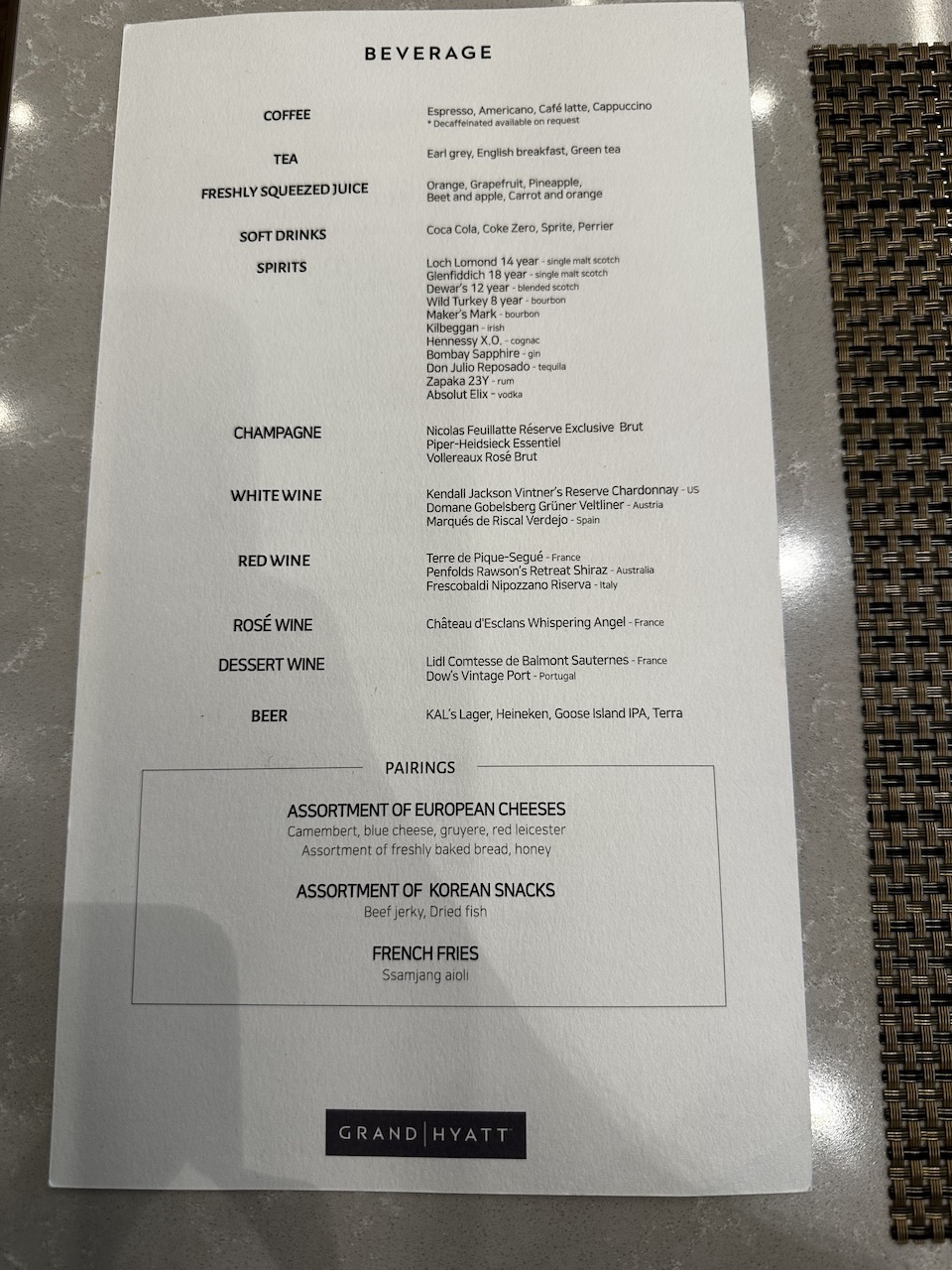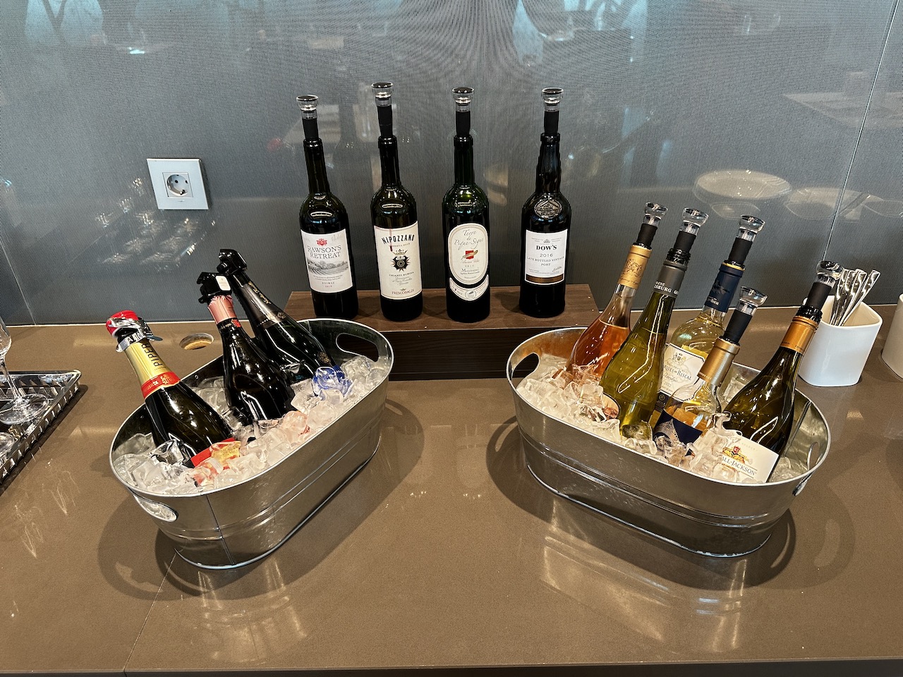 Im Sortiment sind jeweils vier verschiedene Rot- und Weißweine, ein Rosé sowie drei Champagnersorten. Neben Softdrinks werden auch frische Säfte und allerlei Heißgetränke serviert.