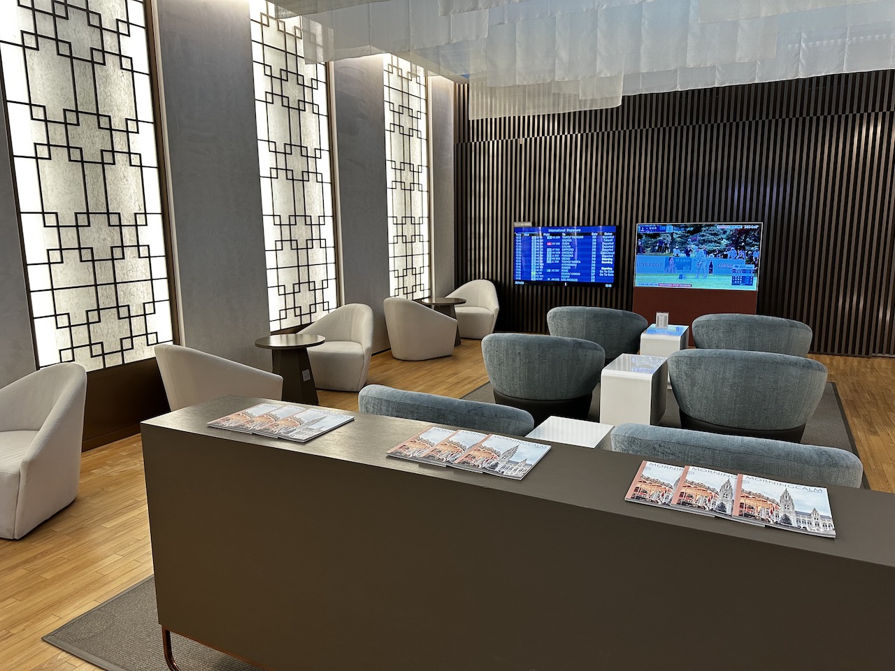 Für eine First Class Lounge eine ziemlich „düstere“ Einrichtung und Ambiente, hier fehlt ein bisschen mehr Farbe, eine Pflanze (meinetwegen auch zwei…), also mein Geschmack ist es definitiv nicht, aber darüber lässt sich ja streiten.