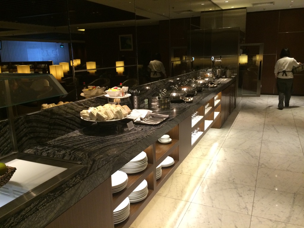 Im vorderen Bereich der Lounge befindet sich das Buffet, an welchem warme und kalte Speisen angeboten werden. Neben einigen abgepackten Sandwiches findet man hier auch mehrere warme Gerichte. Das Angebot an Speisen hat mich zwar nicht beeindruckt, allerdings kann man hier wohl durchaus satt werden.