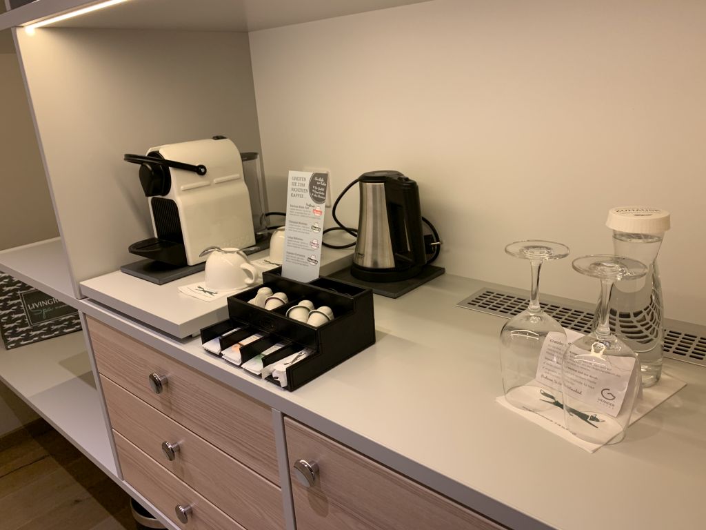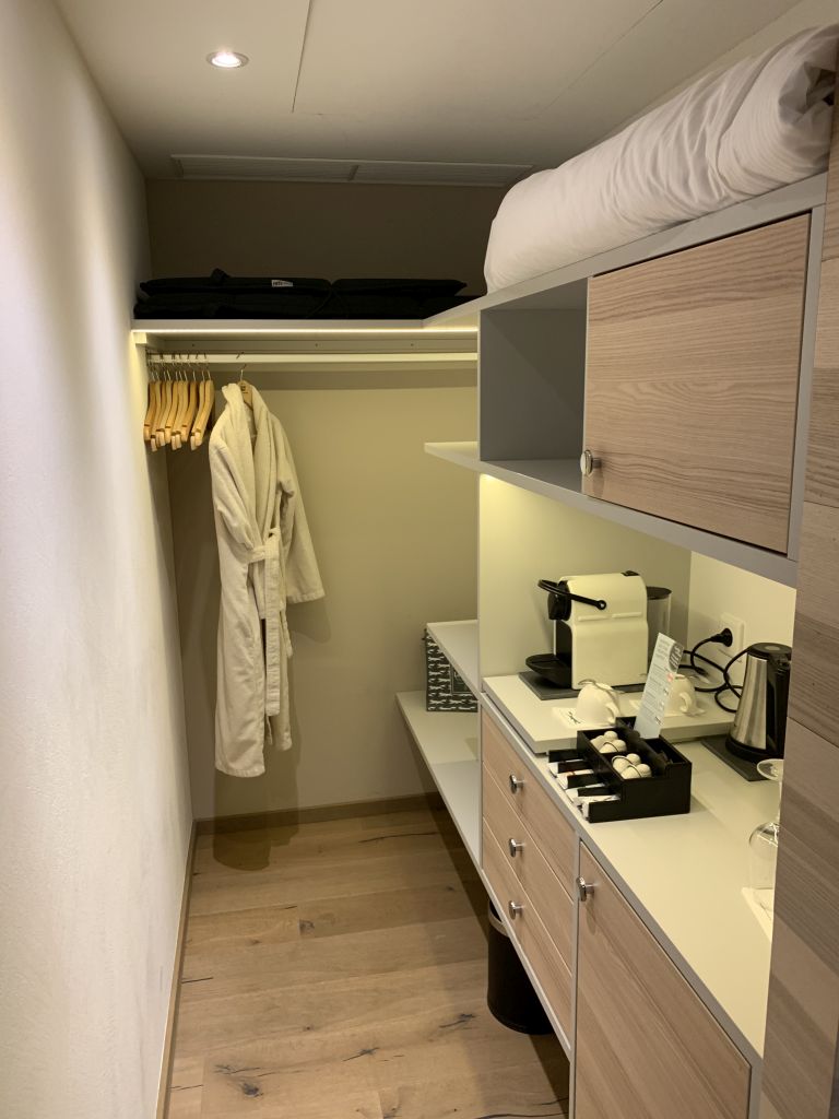 Im begehbaren Kleiderschrank findet sich neben der Garderobe auch eine Nespresso-Kaffeemaschine, ein Wasserkocher und der Tresor.