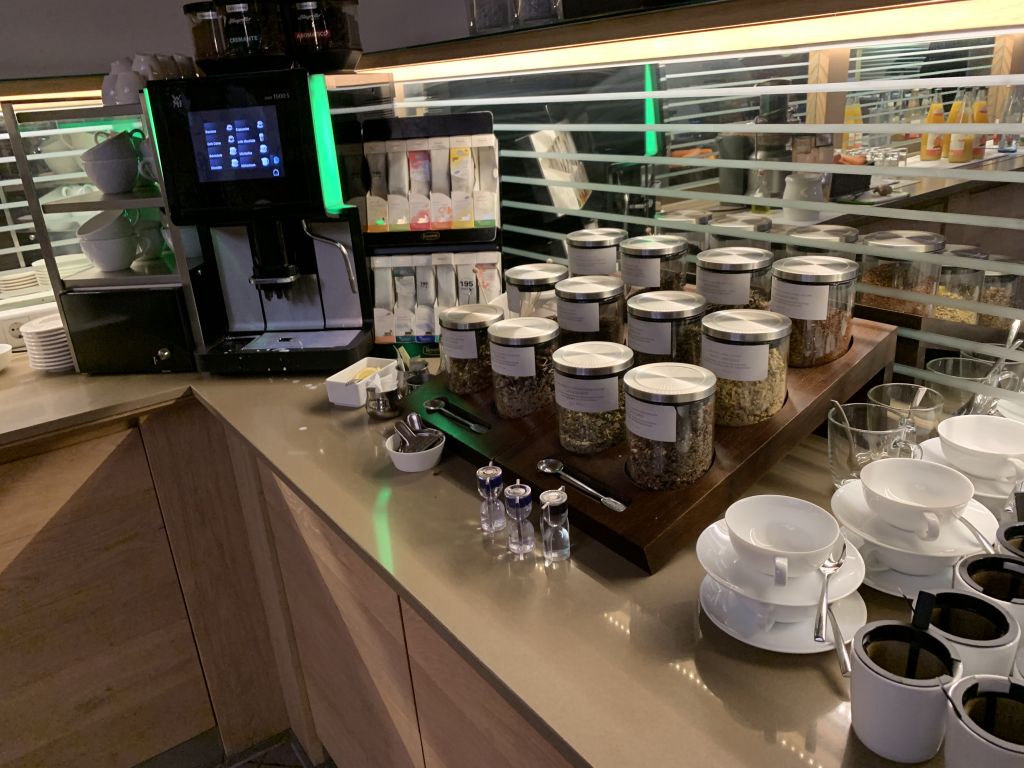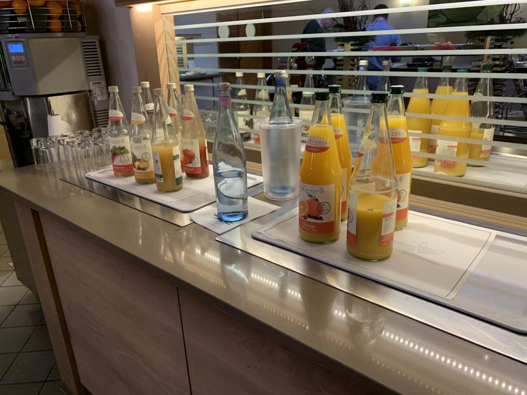 Eine Kaffeespezialität kann man sich selbst an einem Vollautomaten zubereiten. Zusätzlich gibt es diverse Milch, Smoothies, Wasser und diverse Säfte der nahe gelegenen Saftfabrik „Van Nahmen“. Wer schon am Morgen einem Gläschen Alkohol nicht abgeneigt ist, kann sich entweder für Sekt oder einen Frucht-Secco entscheiden.
