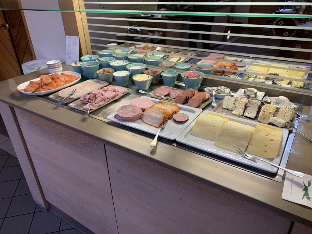 Wer nicht zum Brot oder Brötchen greifen will, kann sich aus einer Auswahl an Müslis und Joghurt bedienen. Und auch Salat ist vorhanden. Eierspeisen, wie Omelettes, werden auf Wunsch an einer Live-Cooking-Station zubereitet. Für den süßen Zahn gab es Kuchen und weiteres Süßgebäck.