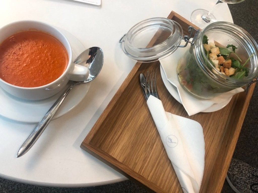 Mein Partner begleitete mich und wir konnten im Vorfeld ohne Probleme auf der Homepage der jeweils durchführenden Airline Sitze reservieren und einchecken. Da es aber Probleme gab gleichzeitig meine Miles&Bonus Nummer der Aegean und die Vielfliegernummer der British Airways für das spätere Leg der LATAM einzulesen gingen wir noch kurz zum leeren Check-In Bereich der Lufthansa und holten uns auch Papierbordkarten ab. Diese sammele ich gerne und fand es interessant eine LATAM Bordkarte in Optik der Lufthansa Group zu ergattern. Nürnberg ist ein Flughafen der kurzen Wege und im Nu sassen wir schon in der Senator Lounge, unmittelbar in der Nähe des späteren Abfluggates nach München. Überrascht stellte ich fest dass es in der Lounge kein Buffet für Speisen mehr gab, vielmehr informiert eine Menükarte über ein individuelles Angebot welches bei den Mitarbeitern bestellt werden konnte. Suppe und Salat hörten sich gut an, die Portionen waren nicht allzu gross aber man konnte hier sicherlich die Bestellung erweitern. Insgesamt eine gute Idee wenn man bedenkt dass ein Buffet permanent und aufwendig sauber gehalten werden muss und mit dem neuen Konzept vielleicht weniger Abfälle entstehen. Darüberhinaus hatte die Bestellung und der Kontakt zu den Mitarbeitern eine persönliche Note.