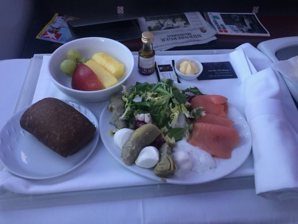 Boarding, push back und take off fanden auch bei diesem Flug zügig und pünktlich statt, die Triebwerke des 320 neo auch für einen Laien als auffällig leise wahrnehmbar. Und jetzt kam auch der Hinweis an die Passagiere über den Engpass der LSG und einem eingeschränkten Service auf diesem Flug- es waren keine Tabletts mit Essen für die Gäste der Business Class beladen und Getränke auf Softdrinks in Plastikbechern beschränkt. Mich persönlich störte das auf dem kurzen Flug gar nicht, zumal ja auch schon der nächste Loungebesuch in greifbare Nähe rückte. Eine Information im Vorfeld wäre dennoch wünschenswert gewesen- zumindest für Gäste der Business Class in Form einer Ansage am Gate oder Benachrichtigung per Push.
