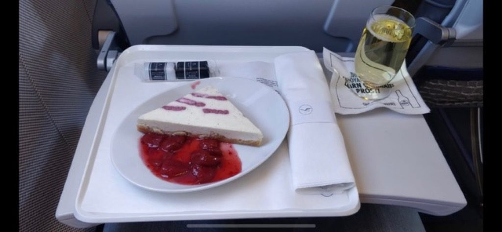 In der Businessclass bietet die Lufthansa (genaugenommen war es in diesem Fall die Cityline) an Bord immer einen freien Nebensitz und auch auf kurzen Strecken einen Imbiss mit Getränken. Obwohl ich diese Tage von Engpässen bei der LSG (dem hauseigenen Cateringbetrieb der LH) gelesen habe gab es auf diesem Flug keine Einschränkungen und ich erfreute mich an einem Käsekuchen mit Erdbeeren und einem Glas Winzersekt.