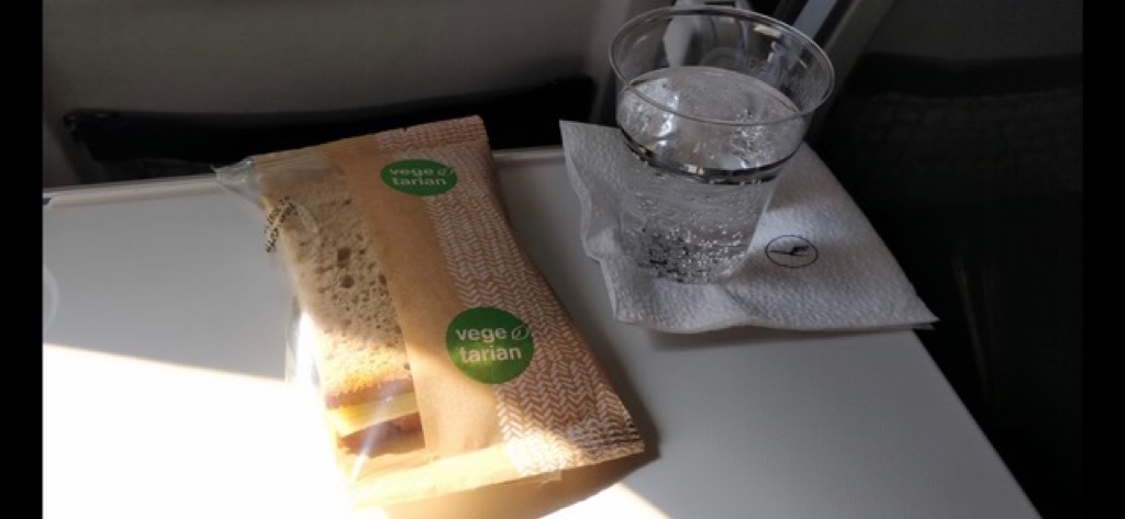 In der Businessclass bietet die Lufthansa (genaugenommen war es in diesem Fall die Cityline) an Bord immer einen freien Nebensitz und auch auf kurzen Strecken einen Imbiss mit Getränken. Obwohl ich diese Tage von Engpässen bei der LSG (dem hauseigenen Cateringbetrieb der LH) gelesen habe gab es auf diesem Flug keine Einschränkungen und ich erfreute mich an einem Käsekuchen mit Erdbeeren und einem Glas Winzersekt.