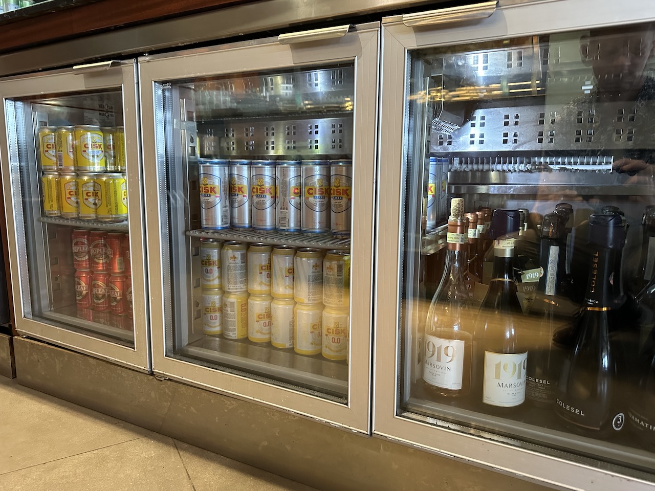 In mehreren Kühlschränken stehen Softdrinks und alkoholische Getränke wie lokale Weine, Sekt und Bier bereit. Darauf sind Wasser, Säfte und Spirituosen samt Eis und Garnitur platziert. Etwas seltsam sind die Gläser welche aus Kunststoff bestehen.