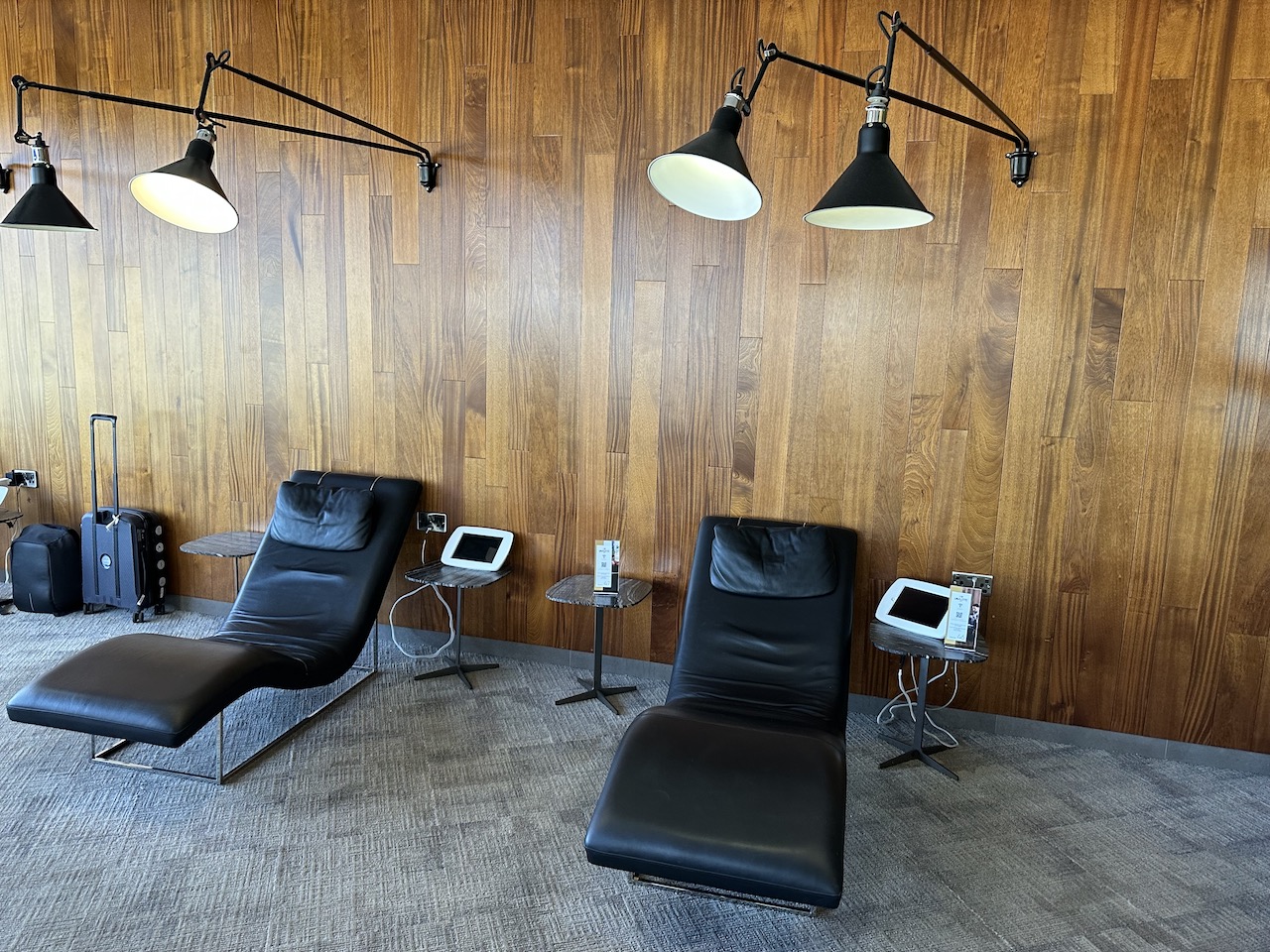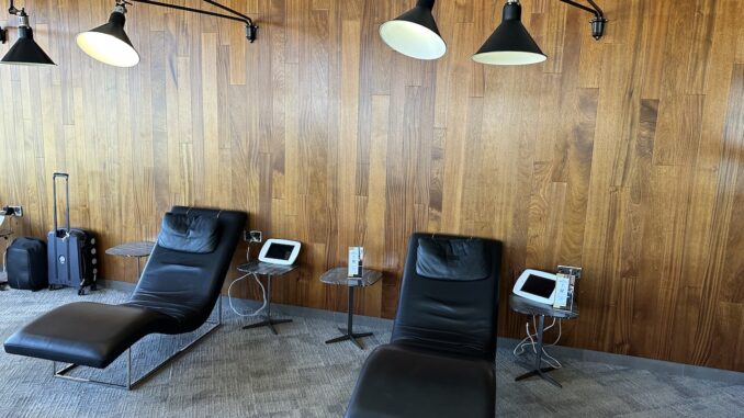 Zahlreiche Einzelsitzplätze, Tische, Sofaecken, Sessel, Barhocker und auch einige Liegen sind in der Lounge verteilt, es gibt viele Steckdosen und USB-Ladebuchsen.