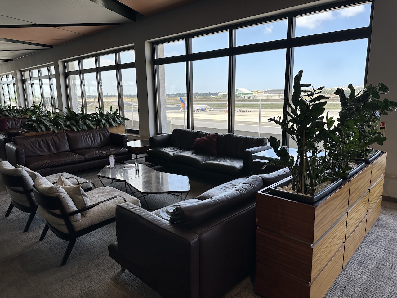 Die Lounge besteht aus einem großen Raum mit hohen Decken und einer großen Fensterfront. Dort kann man wunderbar aufs Vorfeld blicken, die Räumlichkeit ist dadurch entsprechend hell, wobei der dunkle Boden und die Möbel viel Licht schlucken.