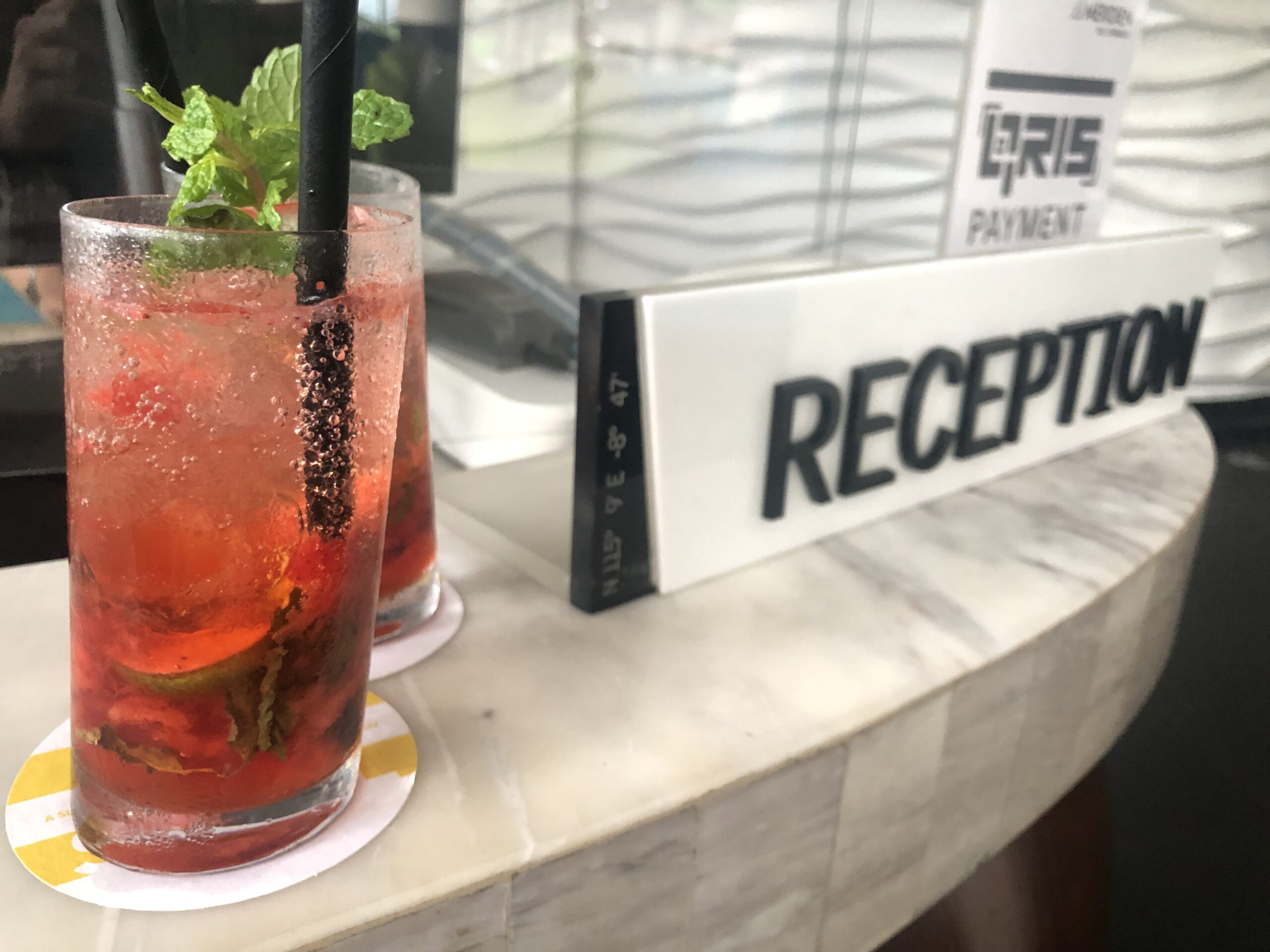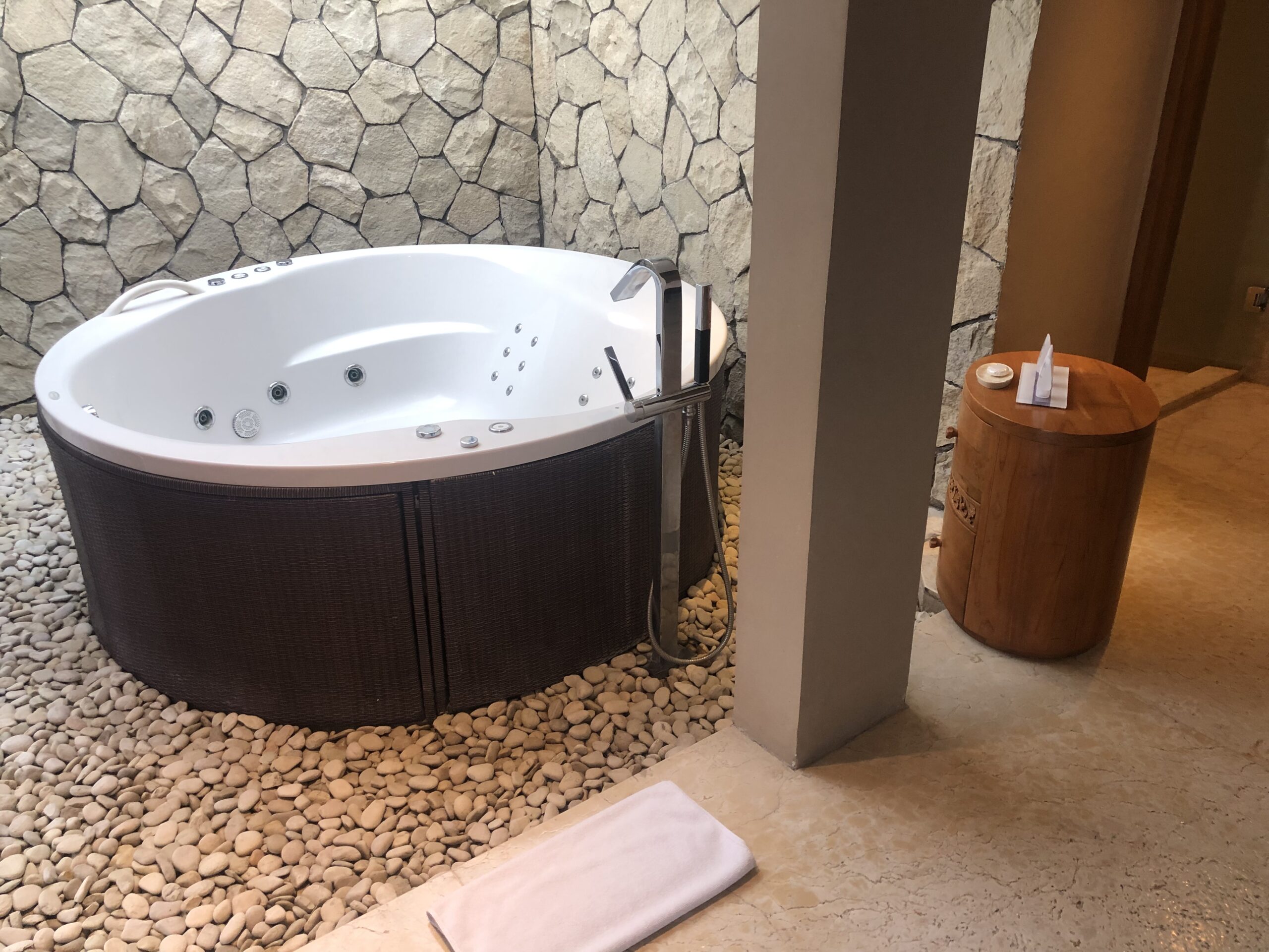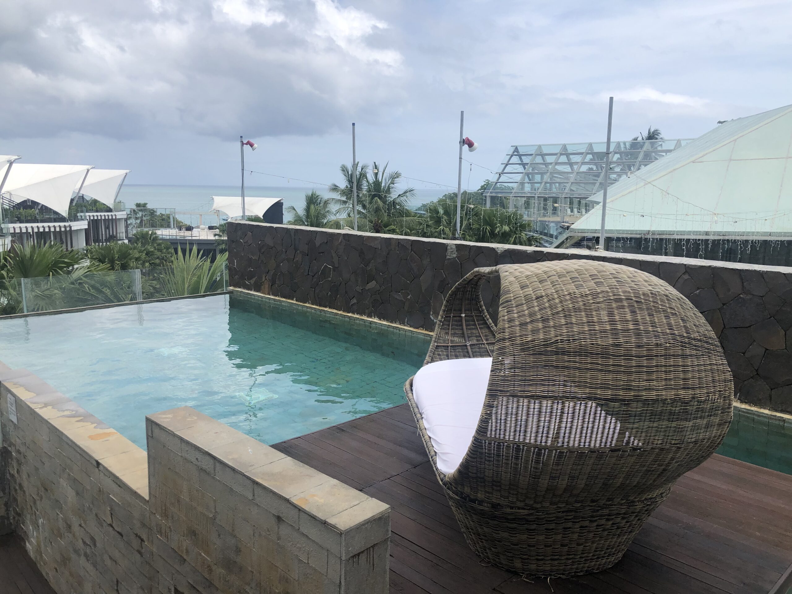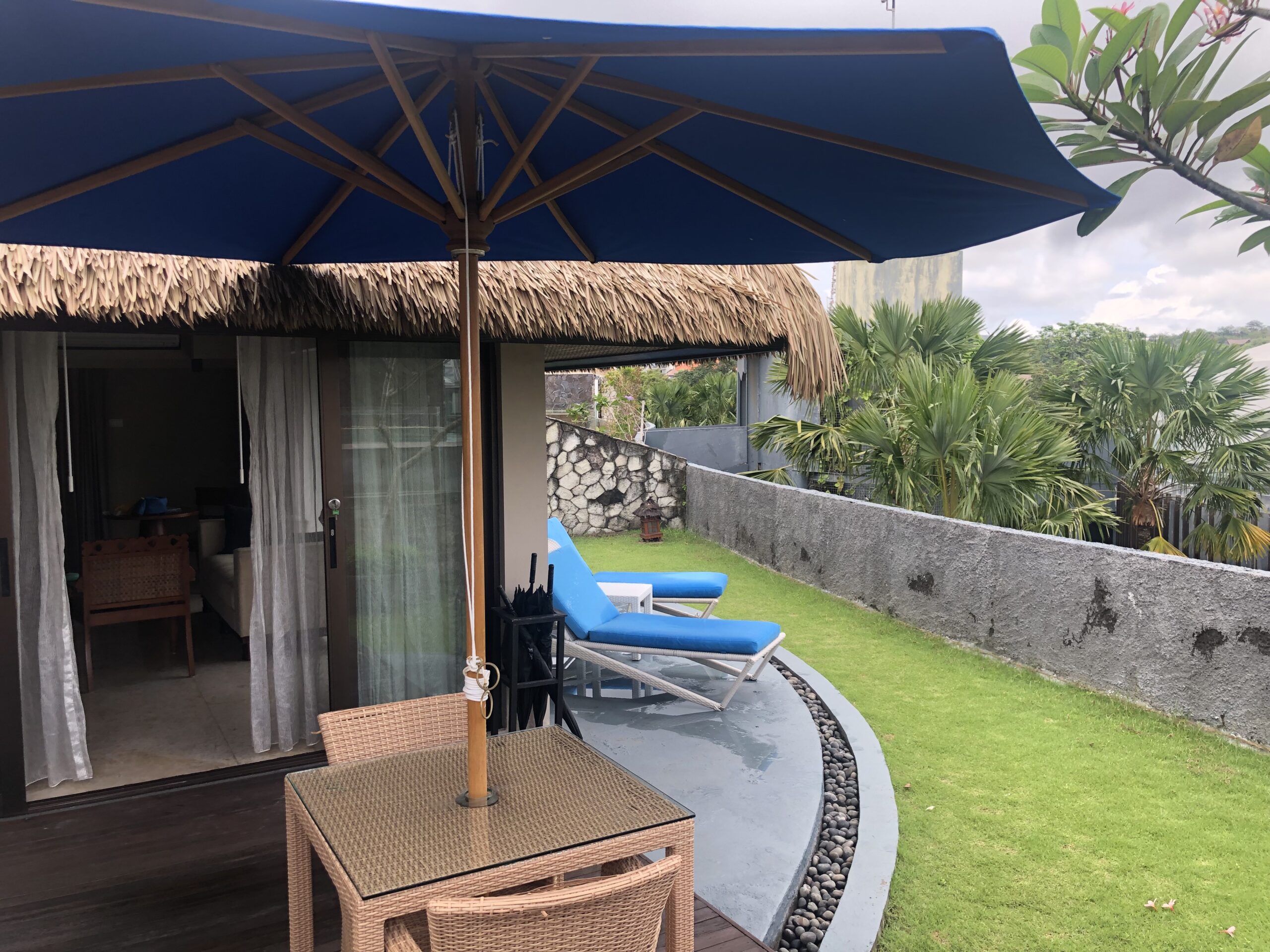 Wir erhielten kalte Tücher und einen leckeren Mocktail zur Begrüßung, die Rezeptionistin bestätigte uns das „kostenfreie“ Upgrade. Diese Leistung fand ich zwar nicht wirklich Gratis, die Voucher sind schließlich wie Punkte oder Meilen zu sehen und Bestandteil des Treueprogramms. Die Villen befinden sich auf dem Dach der Wohngebäude, da es gerade in Strömen regnete erhielten wir einen großen Schirm um trocken ins Zimmer zu gelangen.