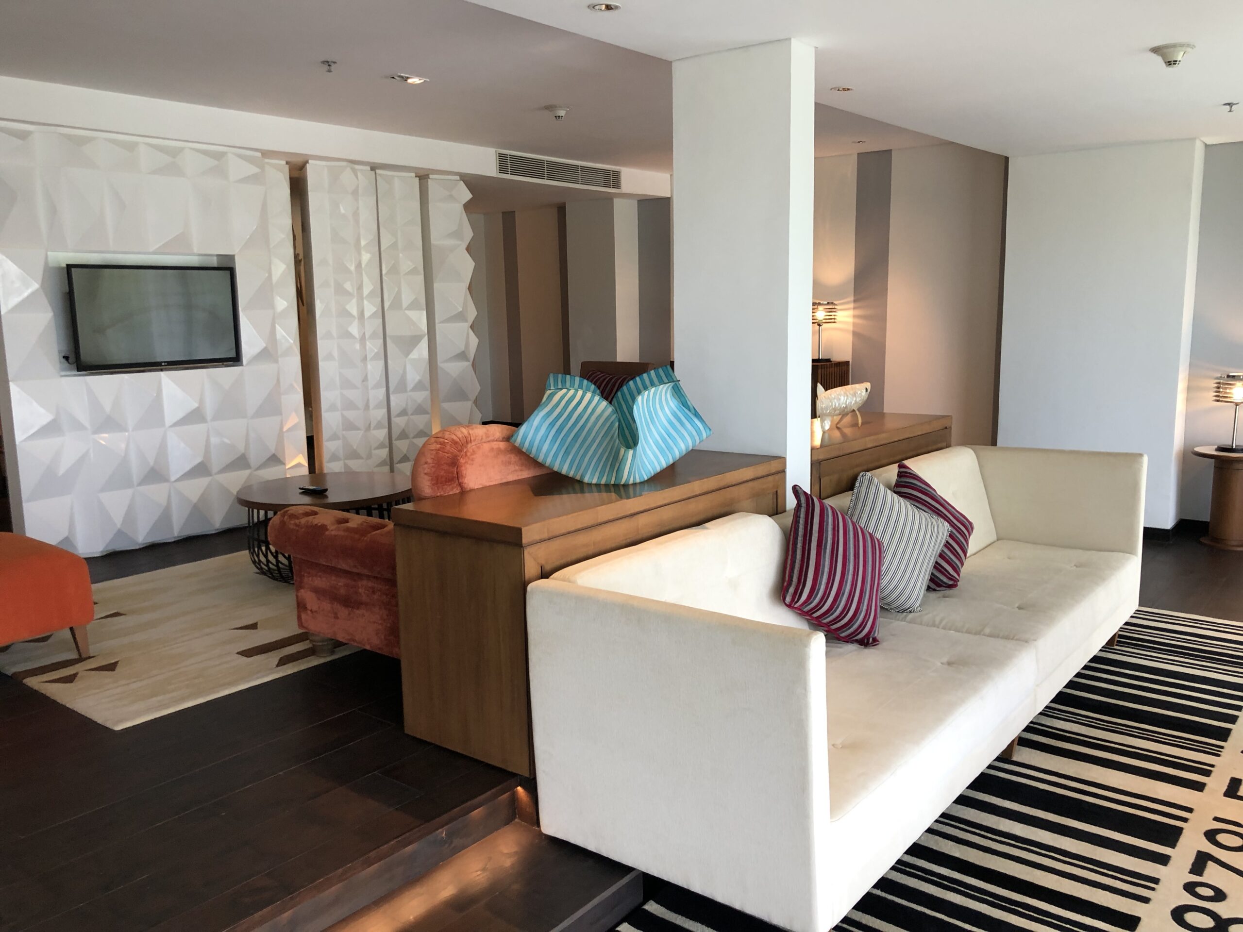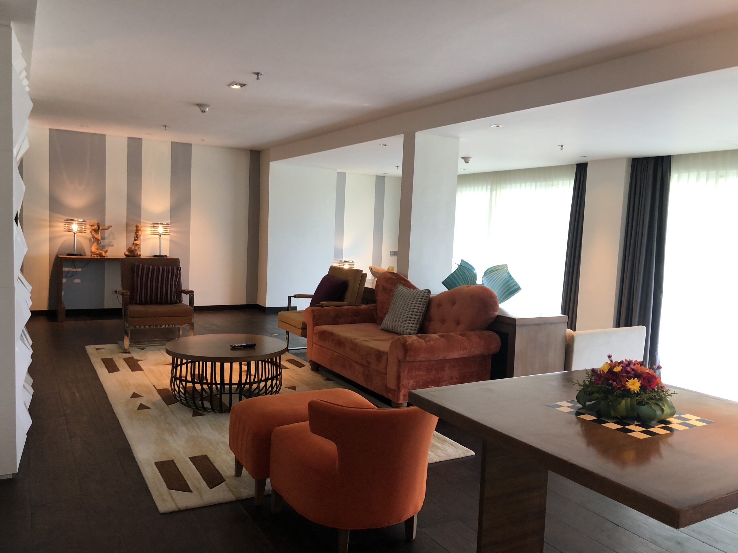 Die Fahrt vom Flughafen zum Hotel dauert lediglich 15 Minuten, hier haben sich Anbieter wie „Grab“ durchgesetzt und bieten die Dienstleistung zu einem überschaubaren Preis sowie passablen Service an. Bereits an der Vorfahrt des Hotels wurden wir wie Götter auf Händen getragen, es folgte ein persönlicher Check-In im etwas höhergelegenen Lobby-Bereich.