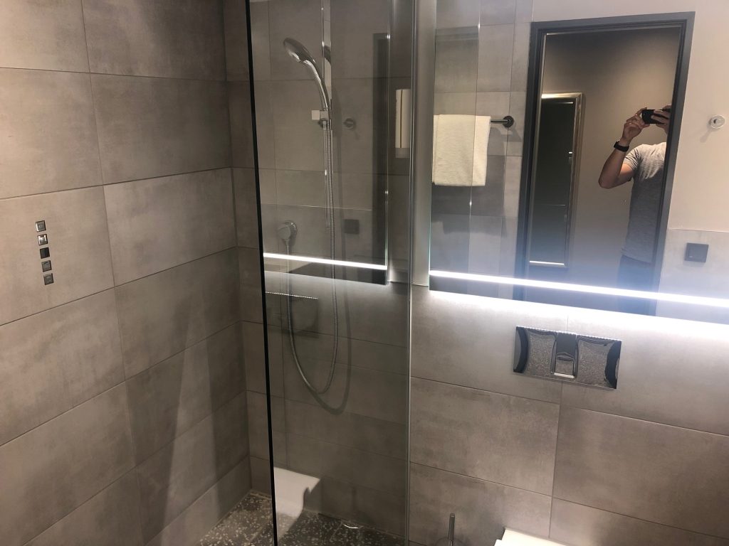 Das Badezimmer verfügt über eine kombinierte Regendusche, die komplett über Tasten in der Wand steuerbar ist und somit auch eine genaue Einstellung der Temperatur ermöglicht.