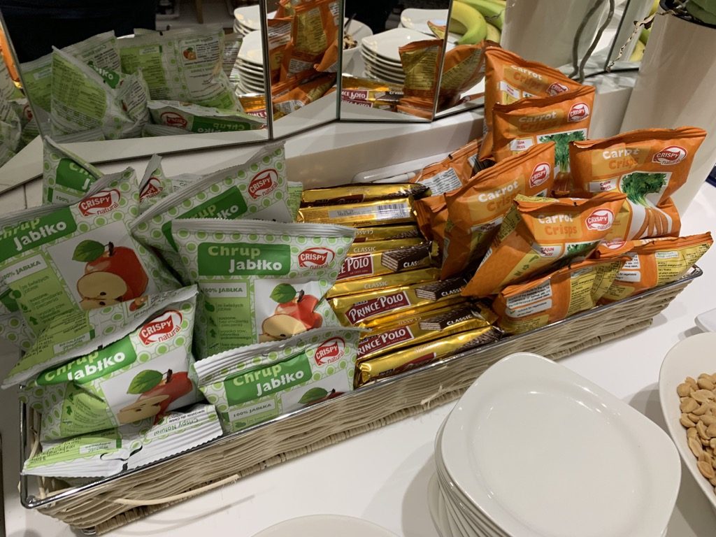Zusätzlich findet man auf dem Buffet noch einige Knabberreien, abgepackte Snacks und frisches Obst.