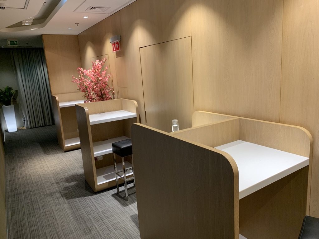 Im Übergang zwischen diesen hinteren Räumen und er eigentlichen Lounge befinden sich noch einige Hochtische, welche sich wohl am besten als Business Center beschreiben lassen. Ich finde sie allerdings nicht besonders angenehm, da sie sich direkt neben den Toiletten in einem Durchgangsflur befinden.