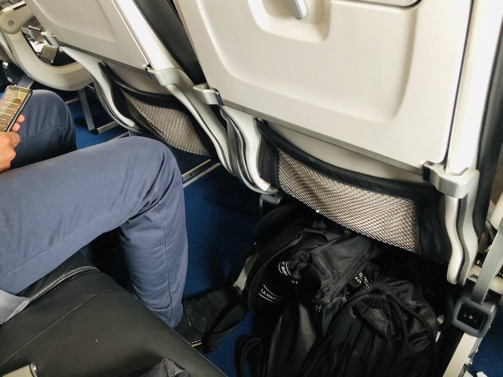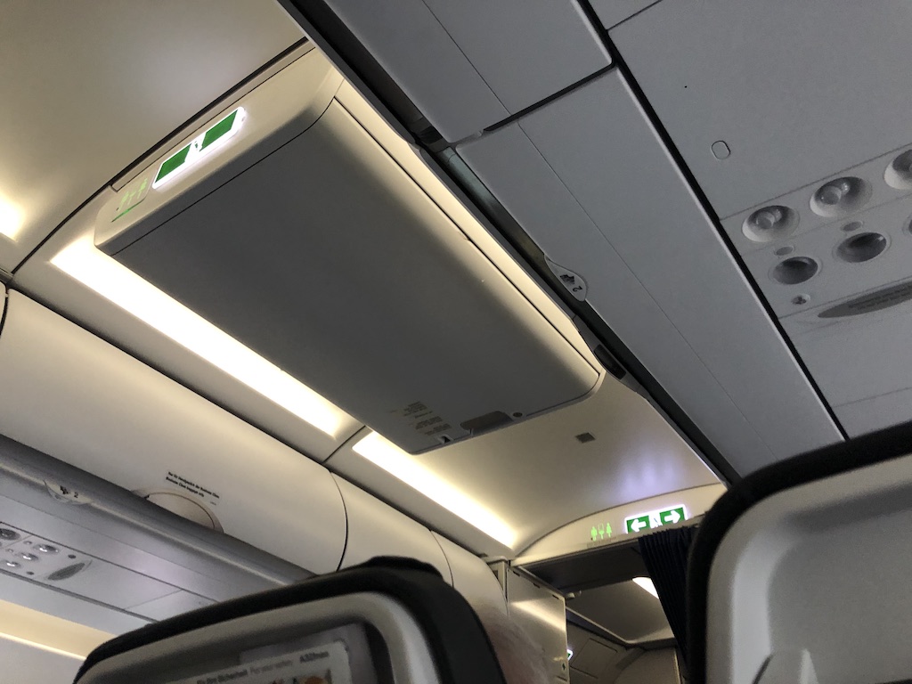 Als ich meinen Sitz eingenommen habe, ist mir ein Deckenfach in der Maschine aufgefallen. Dort gibt es zusätzlichen Stauraum für Notfallequipment der Besatzung, was gleichzeitig mehr Raum für das Handgepäck der Passagiere bedeutet. Insbesondere auf ausgebuchten Flügen ein Dauerproblem.